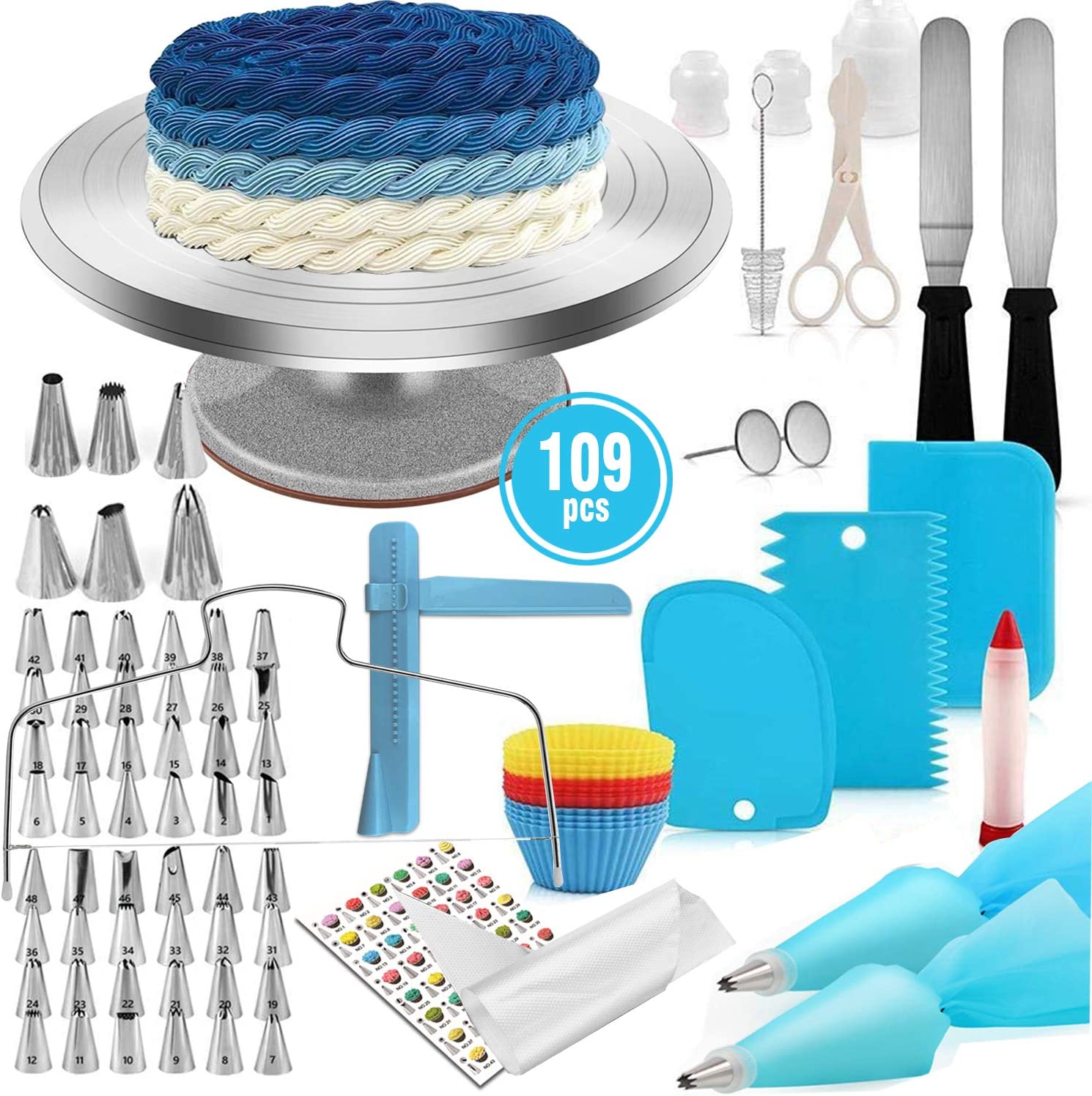 Un kit di 109 utensili preziosi per chi si avvicina alla pasticceria, soprattutto alla decorazione: bocchette di tutte le forme, vassoio girevole, spatole e molto altro.