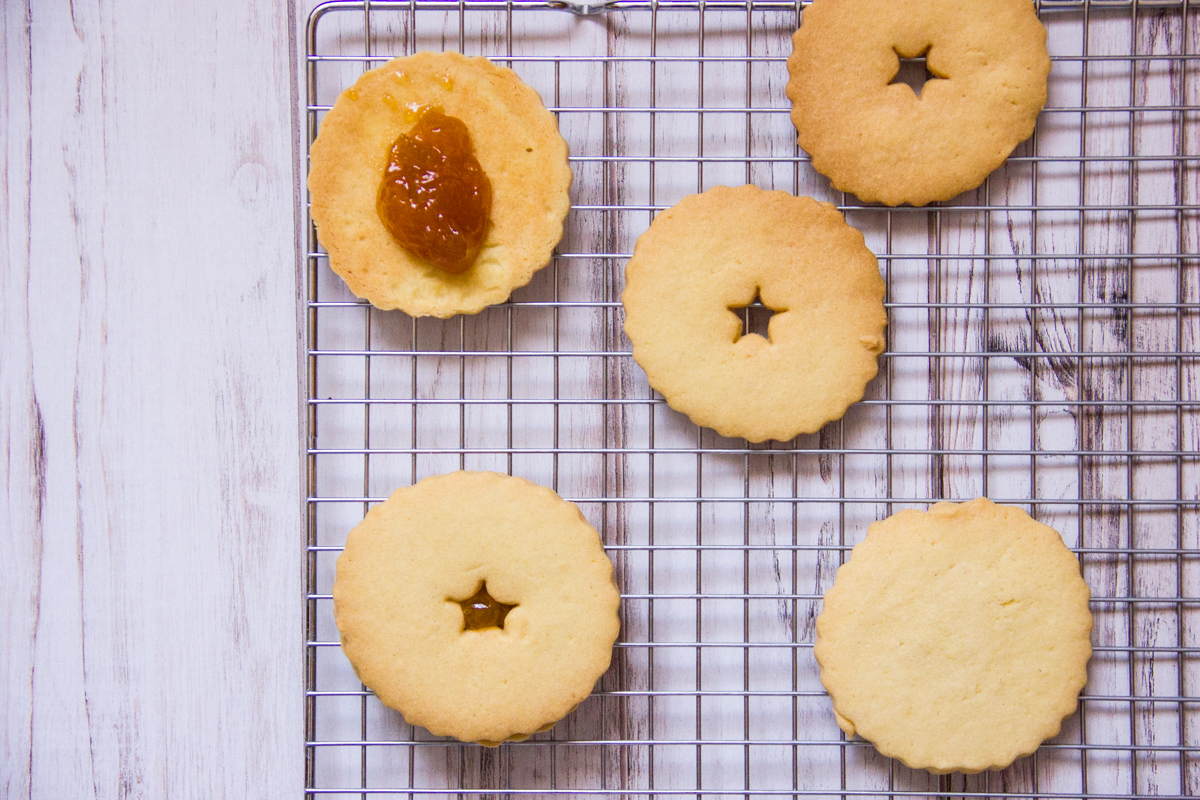 I biscotti a occhio di bue farciti con una profumata confettura di albicocche sono il mio break preferito quando sono in giro per strada e mi fermo a fare colazione: sono una goduria!