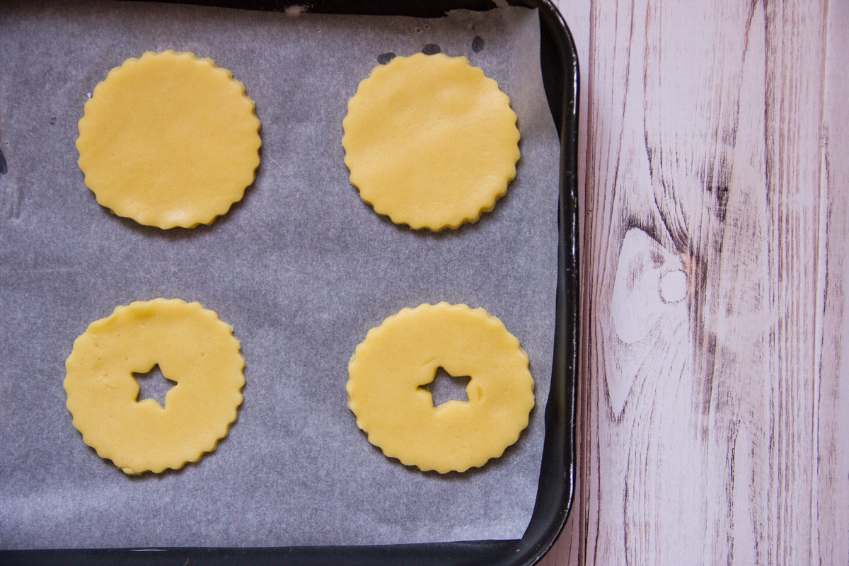 Stendi la frolla ad uno spessore di mezzo centimetro e coppa con un tagliabiscotti.