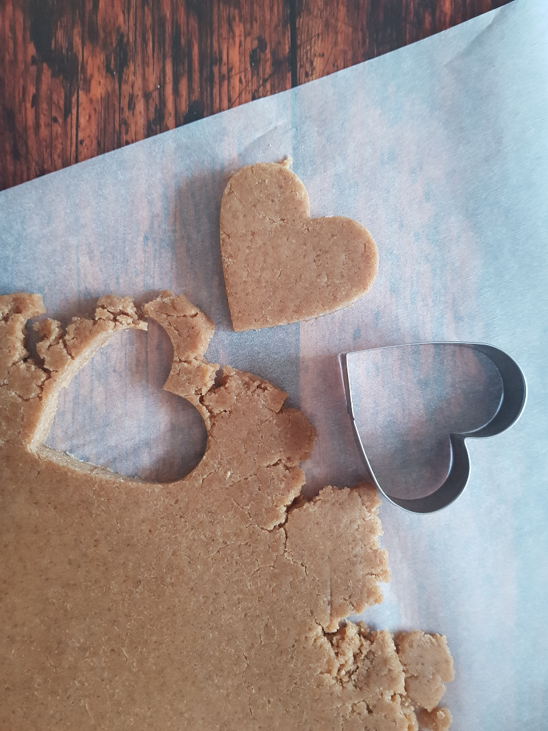 Coppa con il coppapasta che preferisci (io a forma di cuore) e disponili su una teglia rivestita con carta da forno.