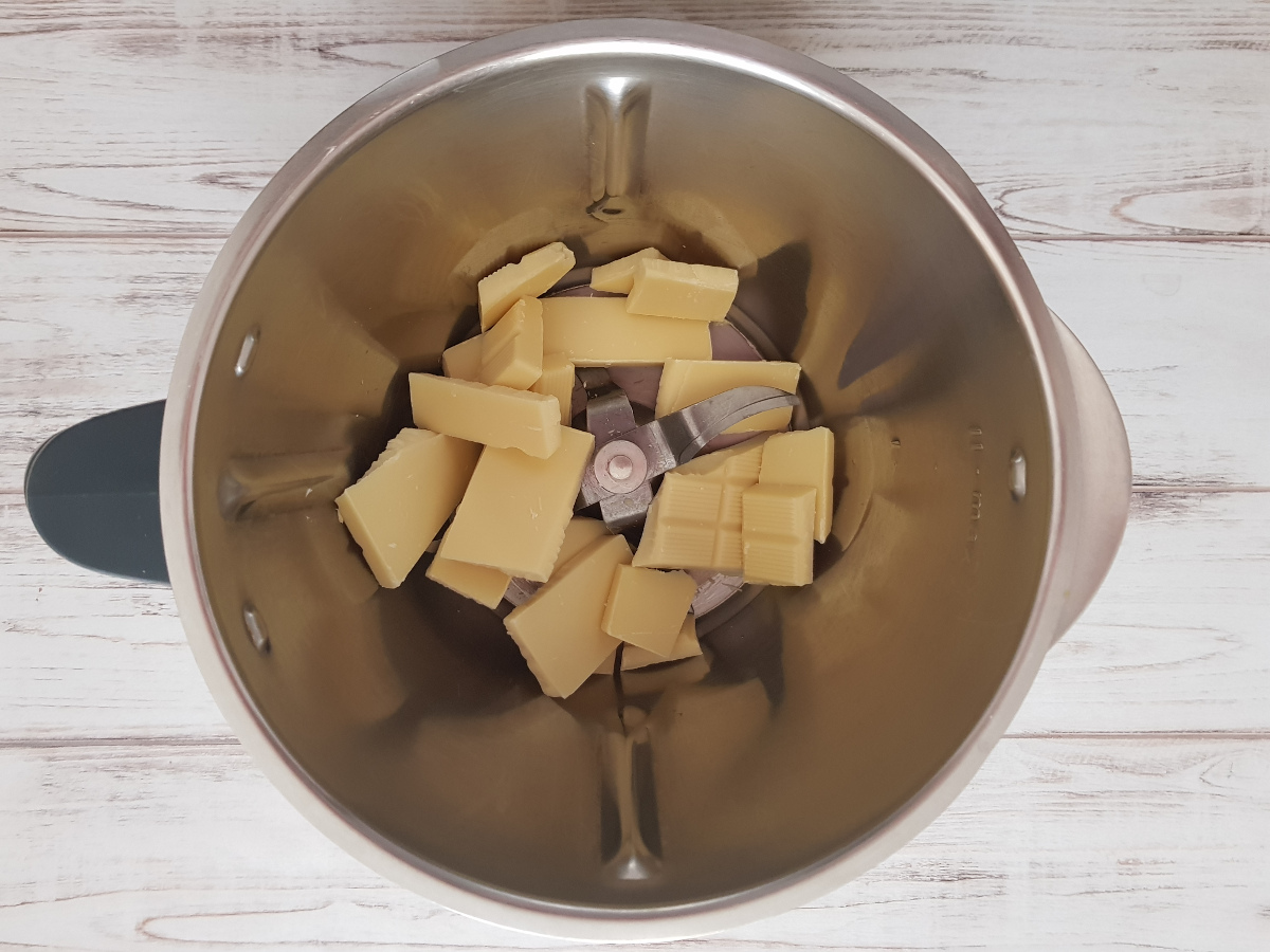 Trita il cioccolato bianco finemente e aggiungi le spezie.