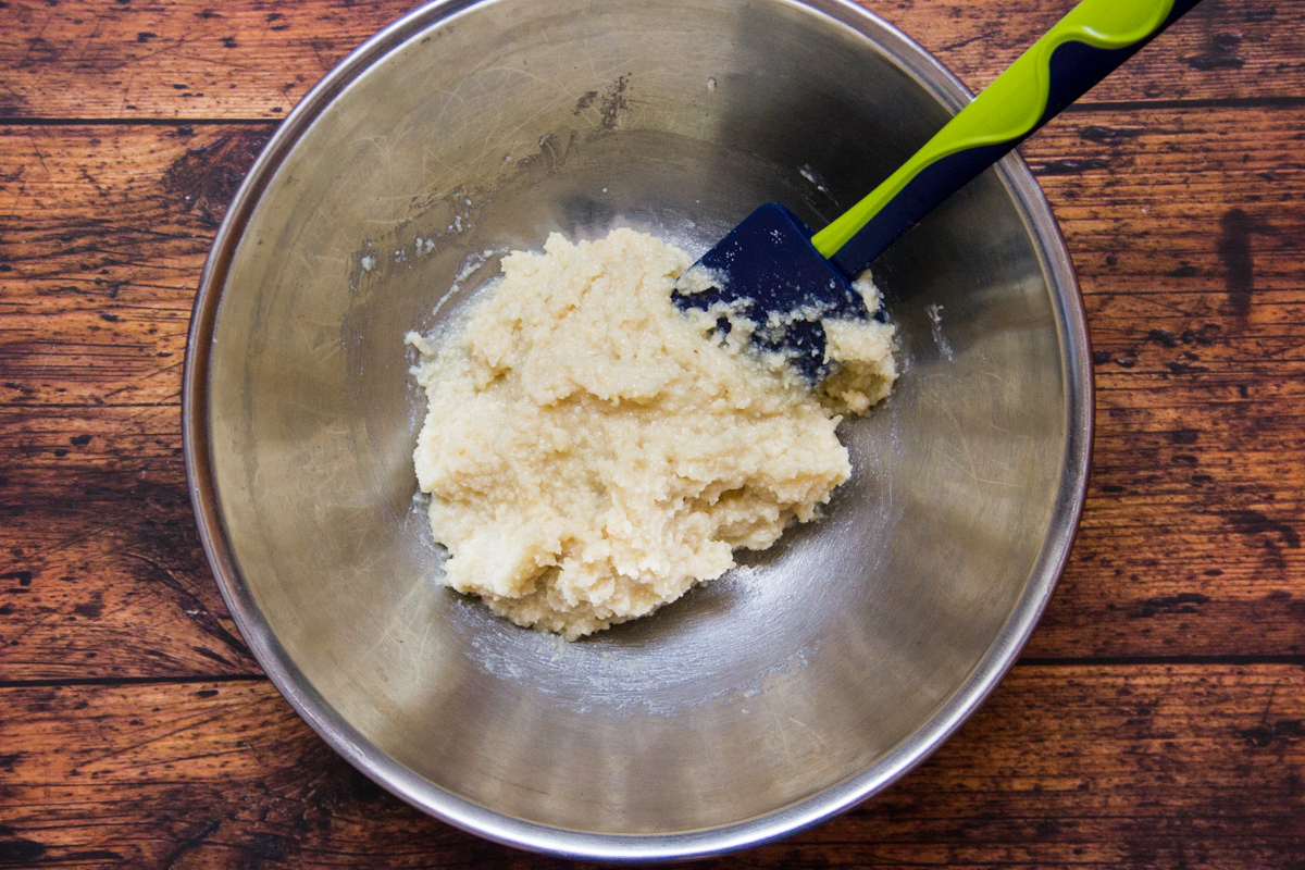 Aggiungi gli albumi mescolando bene con un cucchiaio, fino ad ottenere un impasto appiccicoso e morbido.