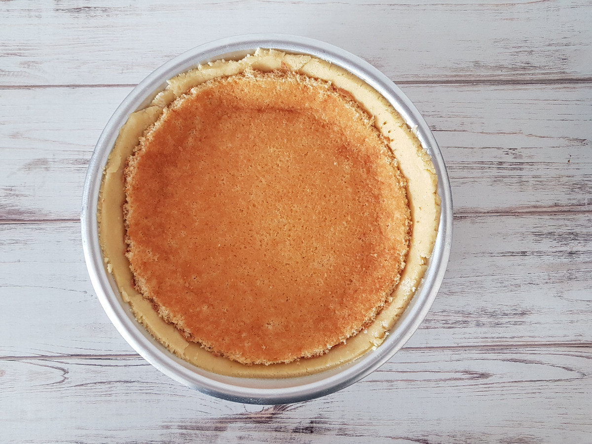 Dividi a metà il Pan di Spagna e inserisci in primo disco sul fondo della frolla, con la parte mollicosa verso l'alto (non deve stare a contatto con la frolla).