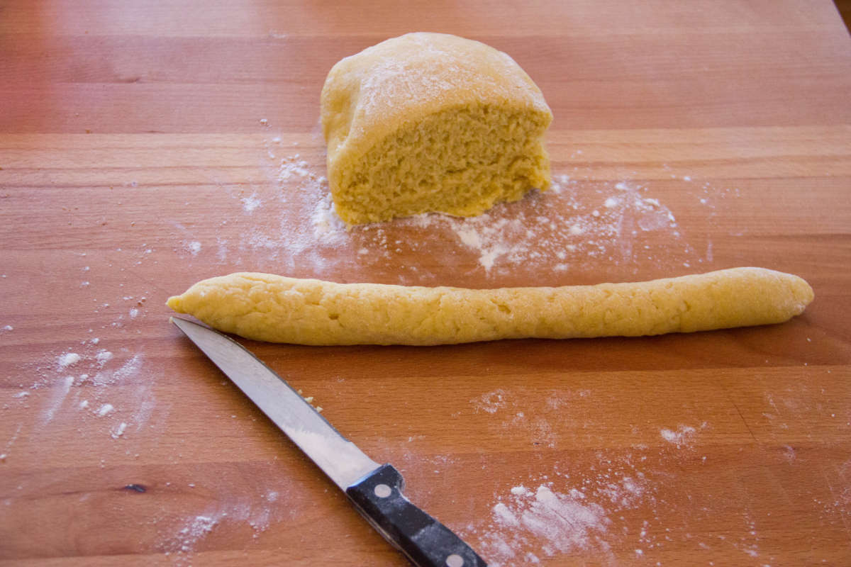 Trascorso il tempo di lievitazione, taglia dei pezzi e ottieni dei salamini sottili.