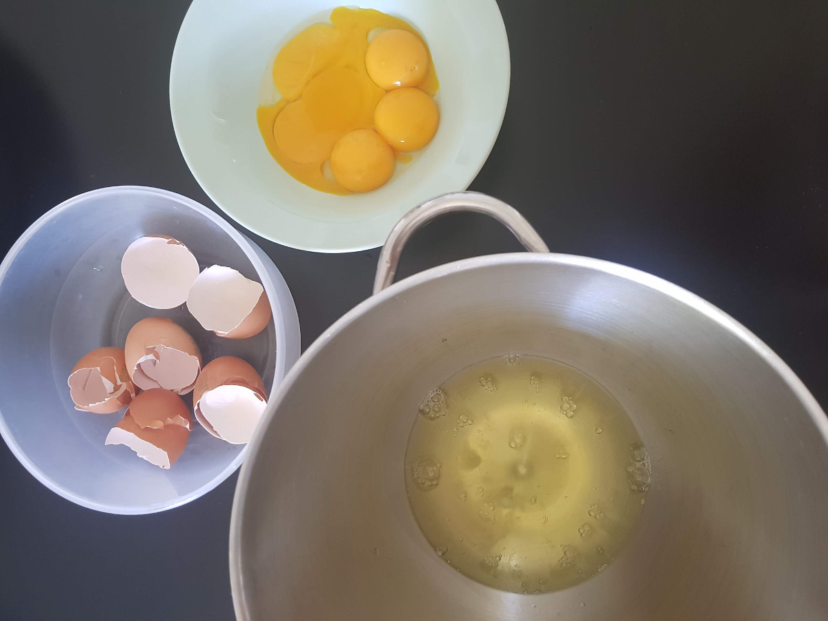 Mescola con delicatezza gli albumi con i tuorli fino ad ottenere un composto liscio.