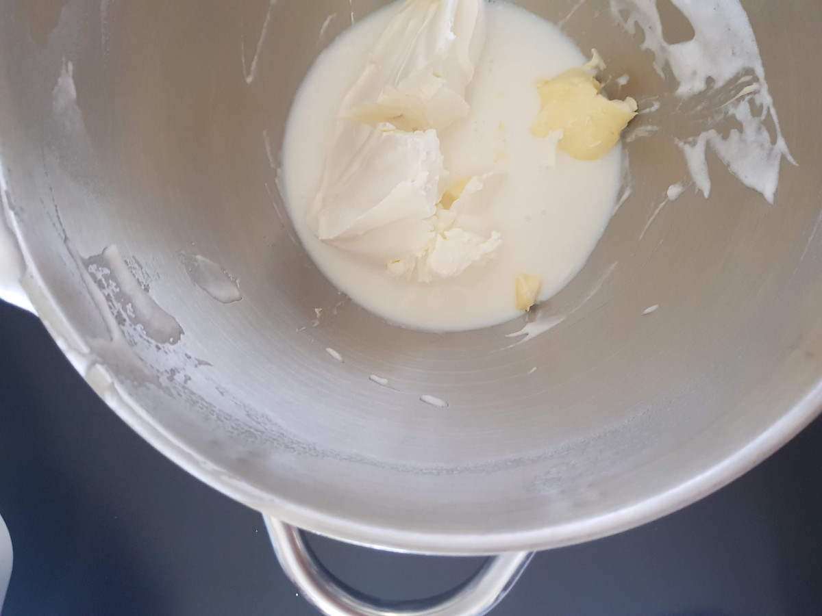Versa gli albumi montati in una ciotola e utilizza la ciotola della planetaria per montare il formaggio spalmabile con lo zucchero a velo (i 50 g rimanenti). Aggiungi il burro morbido e monta. Aggiungi gli amidi (farina e amido) e mescola.