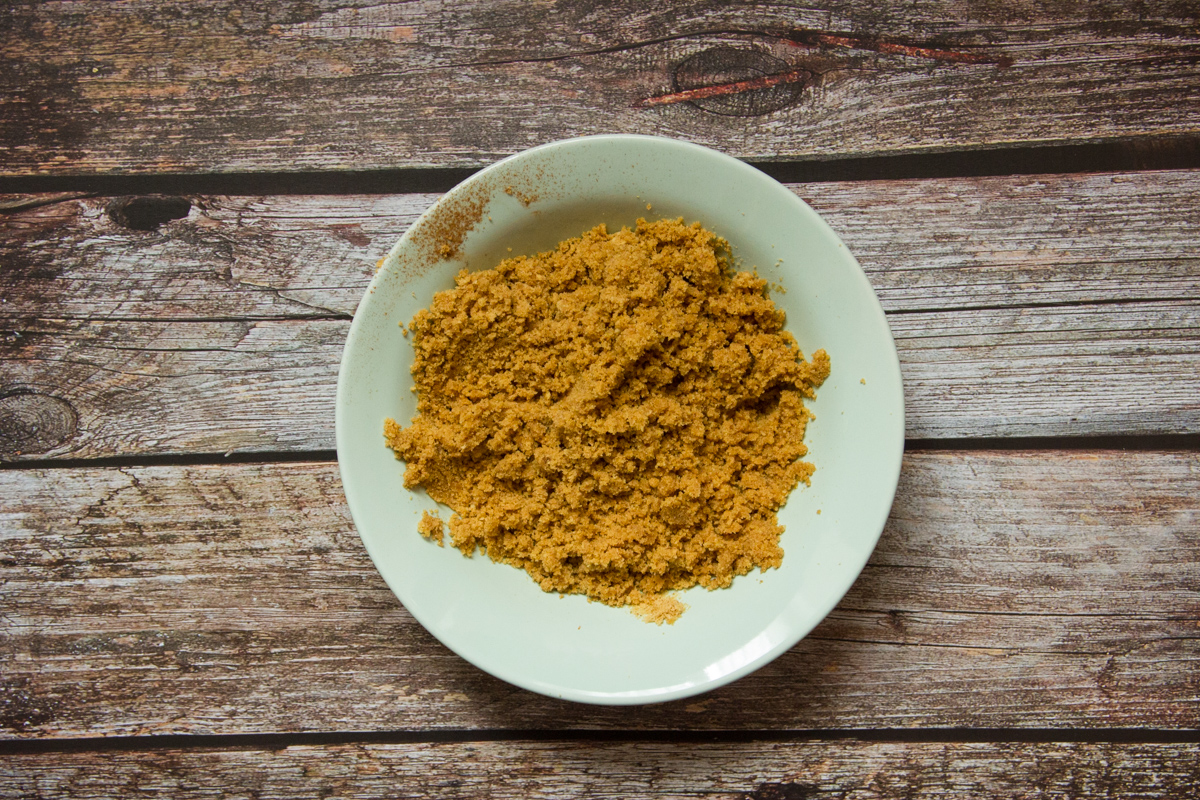 Versa i biscotti sbriciolati in una ciotola e aggiungi il burro fuso e la cannella in polvere.