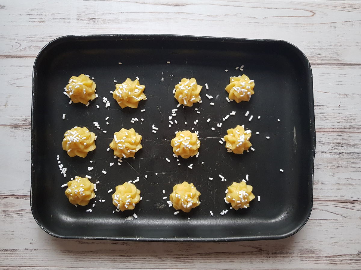Trasferisci il composto in una sac à poche munita di bocchetta a stella, forma i bignè sulla lastra su cui avrai steso un velo di spray staccante (o burro), cospargi la superficie con la granella di zucchero e cuoci 15 minuti a 180°C.