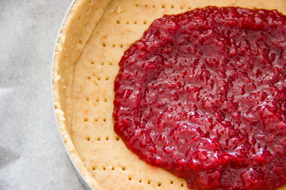 Bucherella il fondo della frolla con una forchetta e aggiungi la confettura di lamponi.