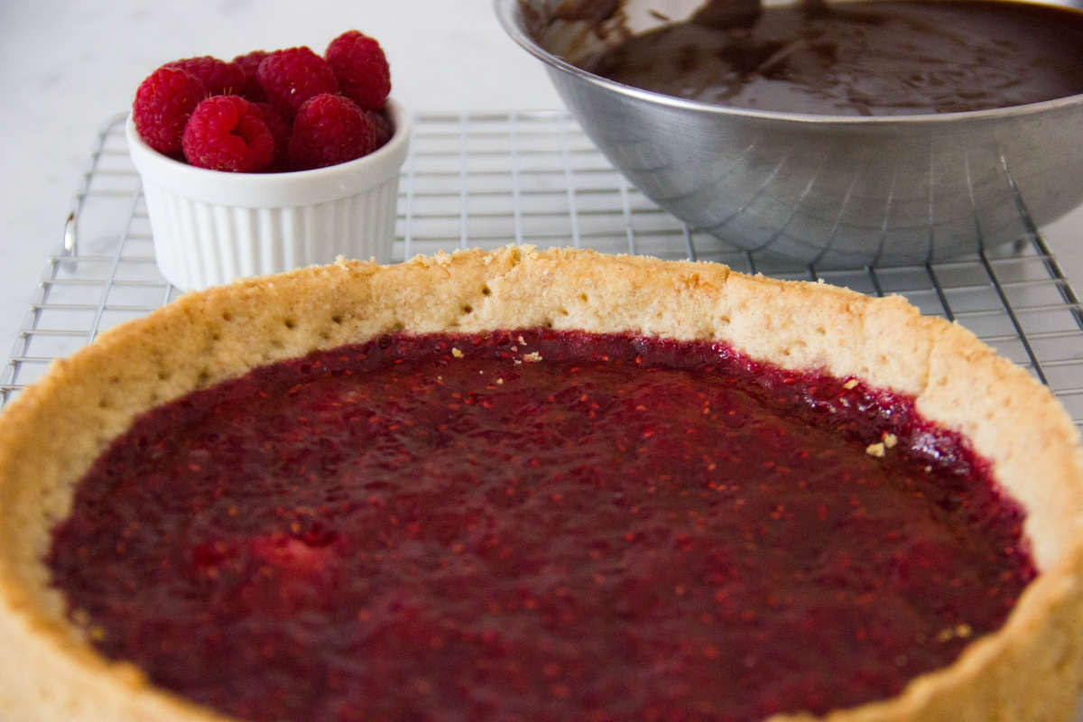 Una volta che la ganache è tiepida, versala sulla confettura di lamponi e lascia riposare in frigo per un'ora.
