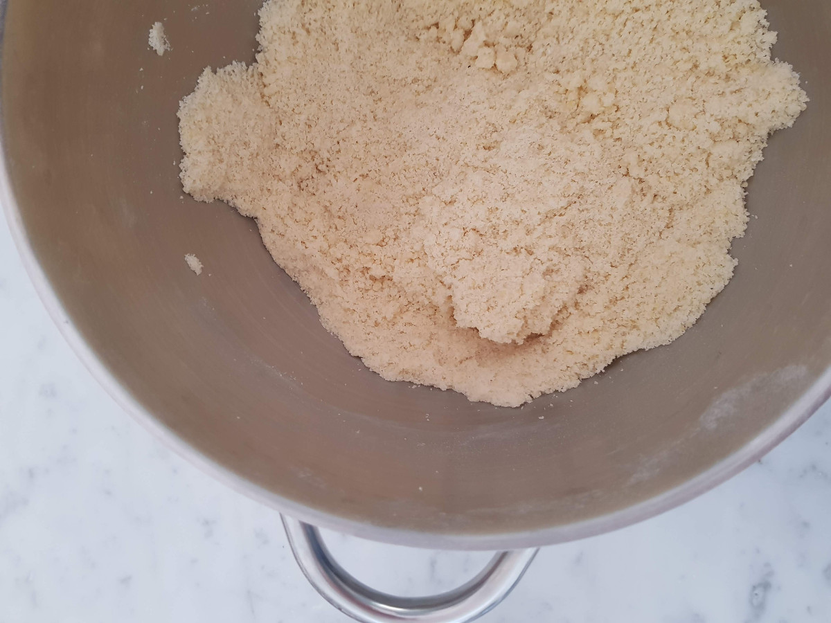 Metti tutti gli ingredienti nella ciotola della planetaria e inizia a mescolarli con la foglia fino a quando non si formano delle grosse briciole.