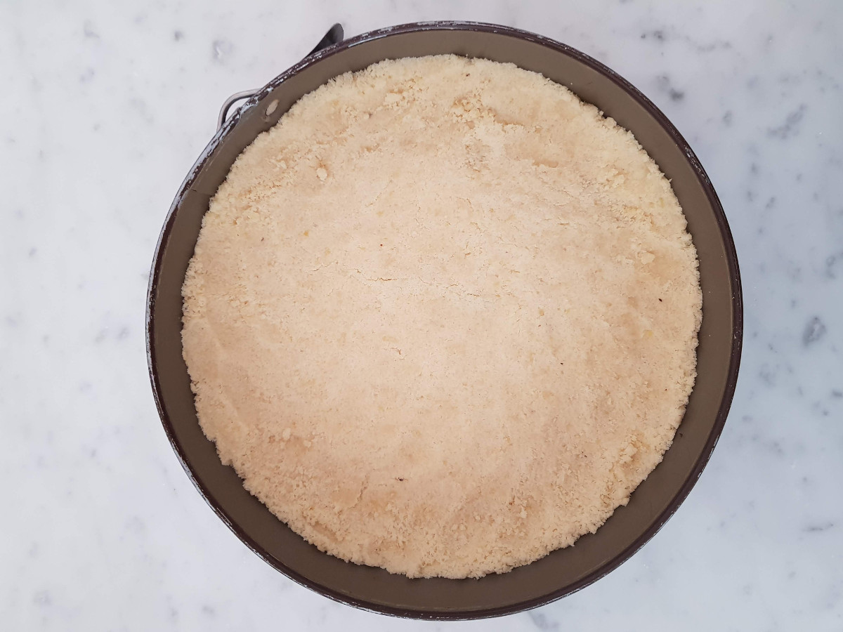 Stendi metà della pasta frolla sul fondo della tortiera e schiacciala con le dita in modo da creare il fondo.