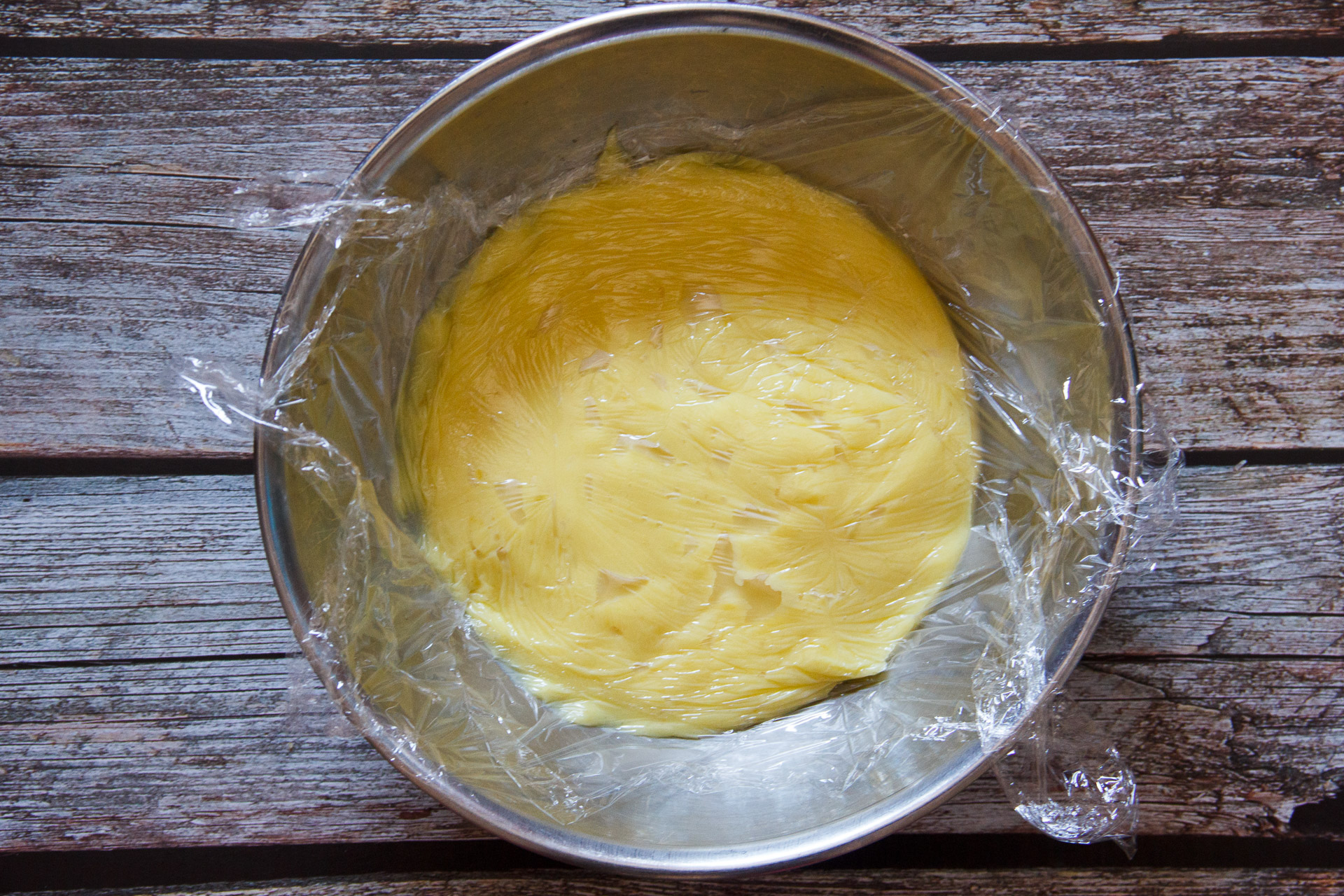 Versa la crema in un piatto e copri con la pellicola a contatto.