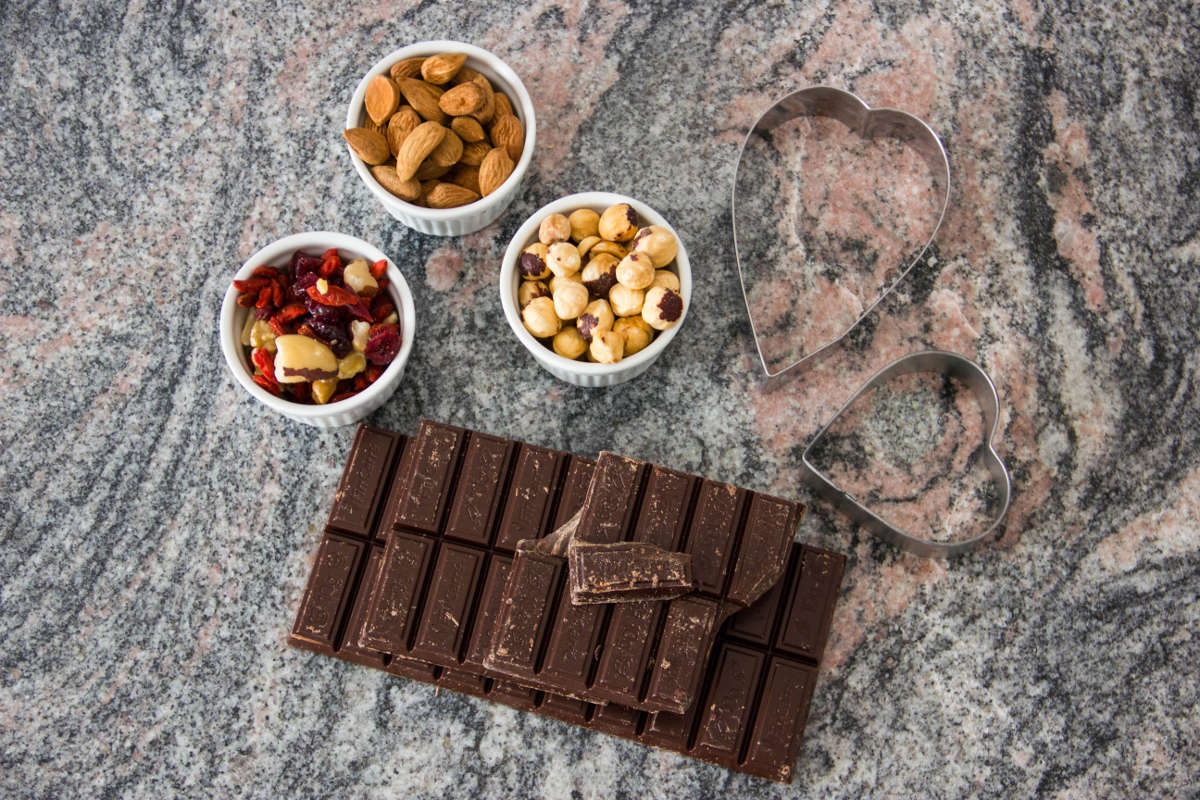 Golosi cuoricini di cioccolato fondente tempestati da frutta secca per festeggiare San Valentino.