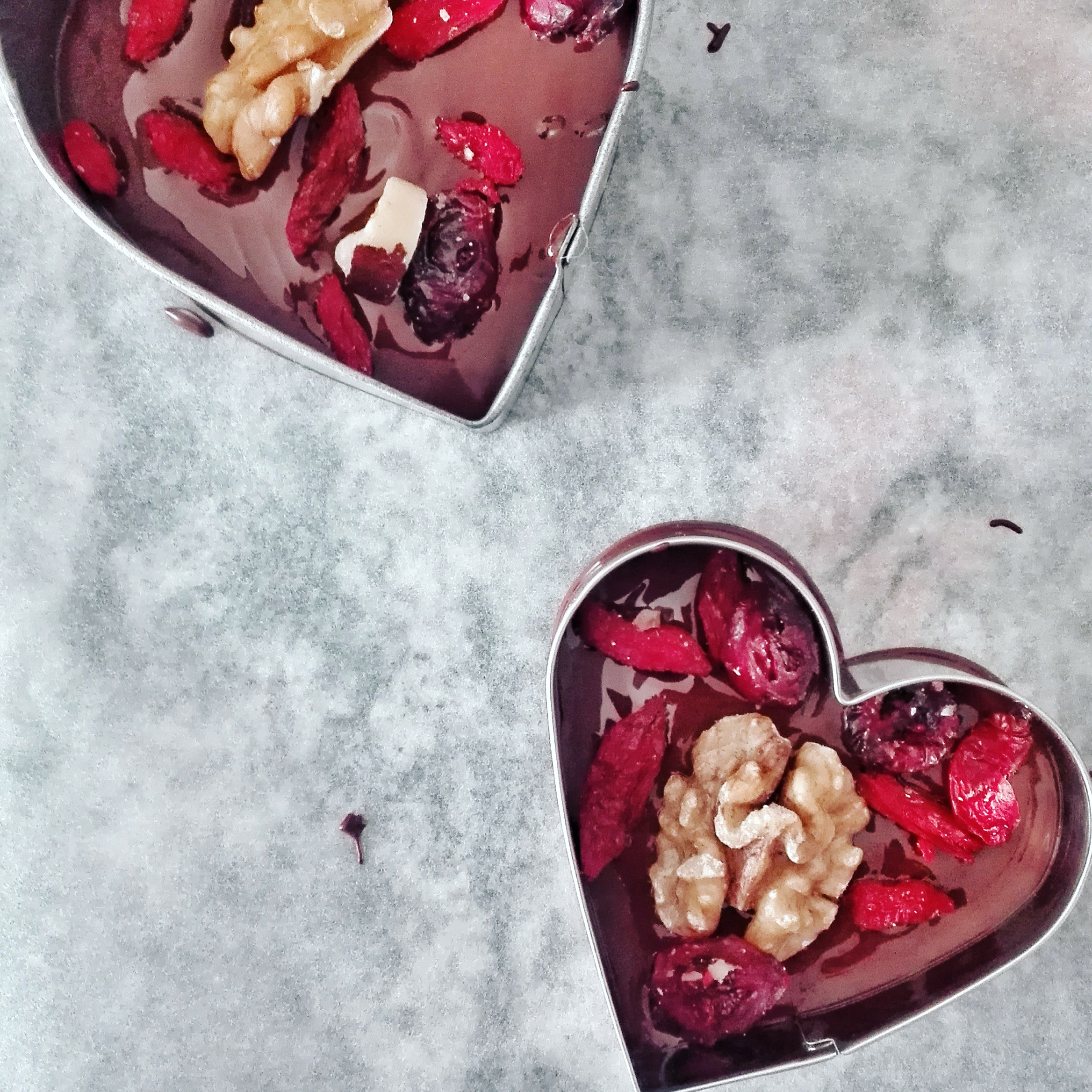 Golosi cuoricini di cioccolato fondente tempestati di frutta secca per festeggiare San Valentino. Un dolce regalo preparato con le tue mani.