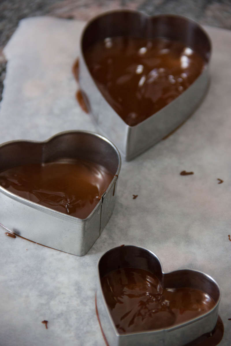 Disponi le formine a forma di cuore sulla carta da forno e versa all'interno il cioccolato, aiutandoti con il cucchiaio.
