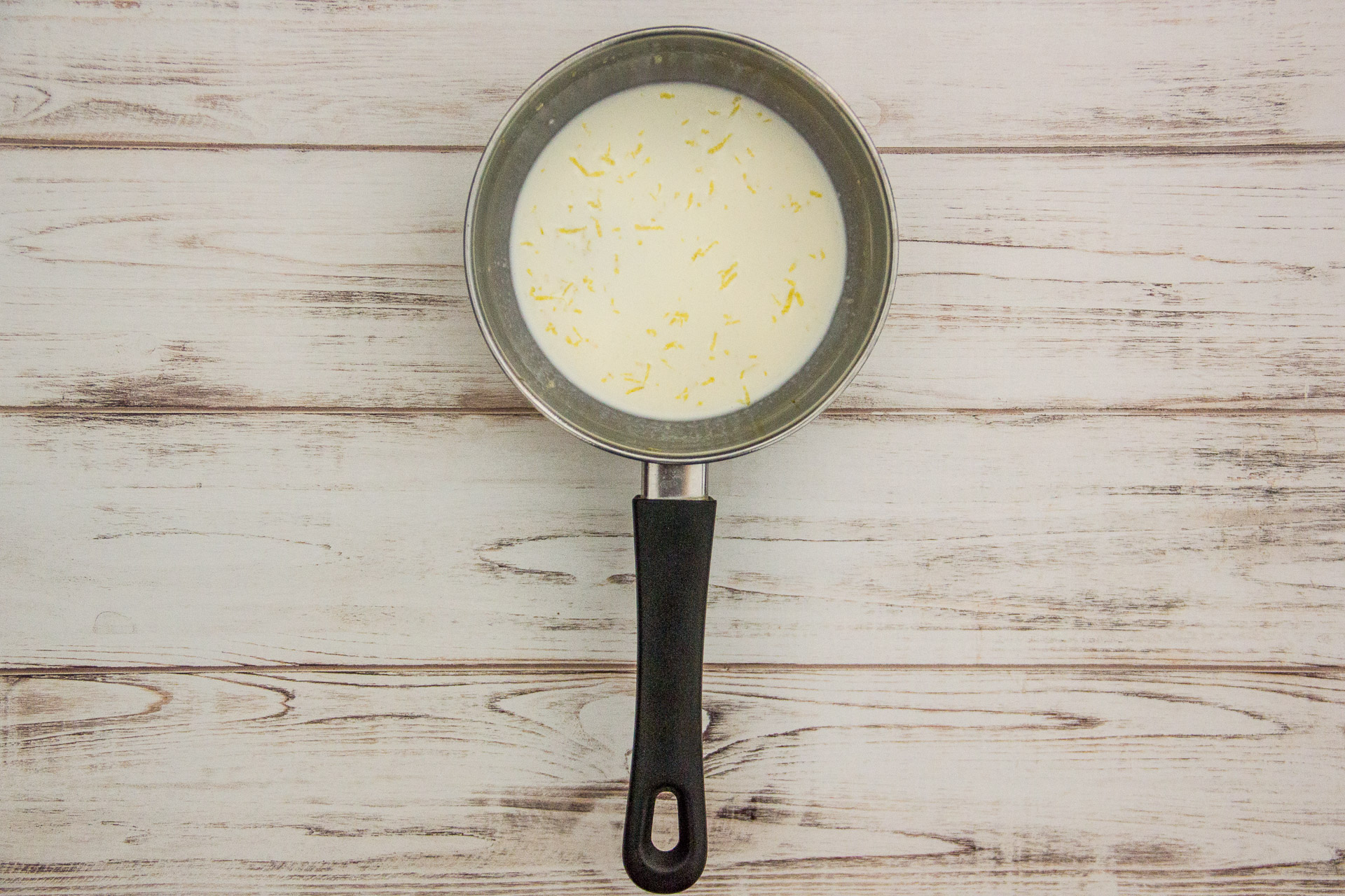 Porta ad ebollizione il latte, la panna, lo sciroppo di glucosio e le zeste di agrumi in un pentolino.