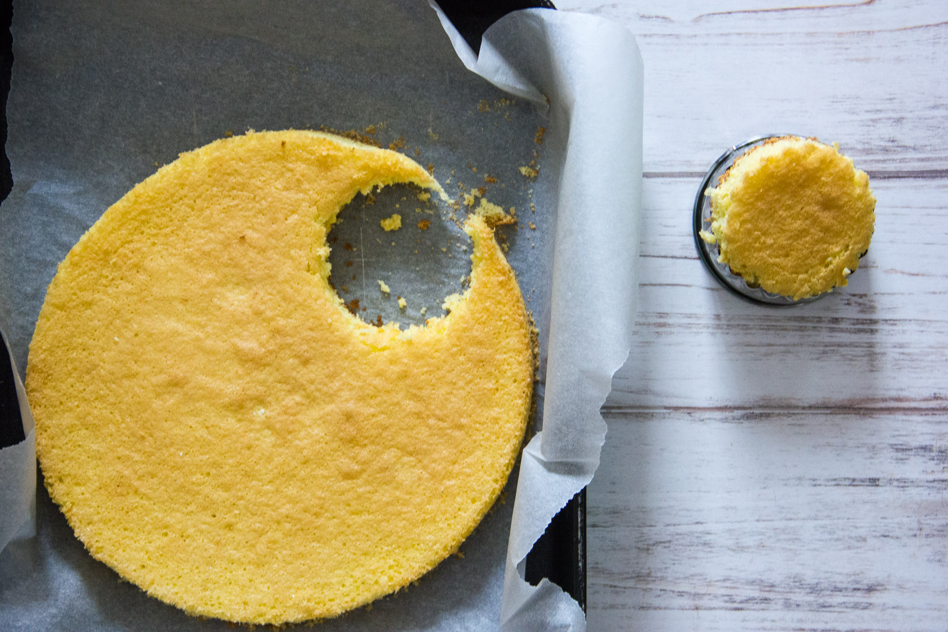 Coppa il Pan di Spagna con un coppapasta tondo leggermente più piccolo del diametro degli stampi a semisfera.