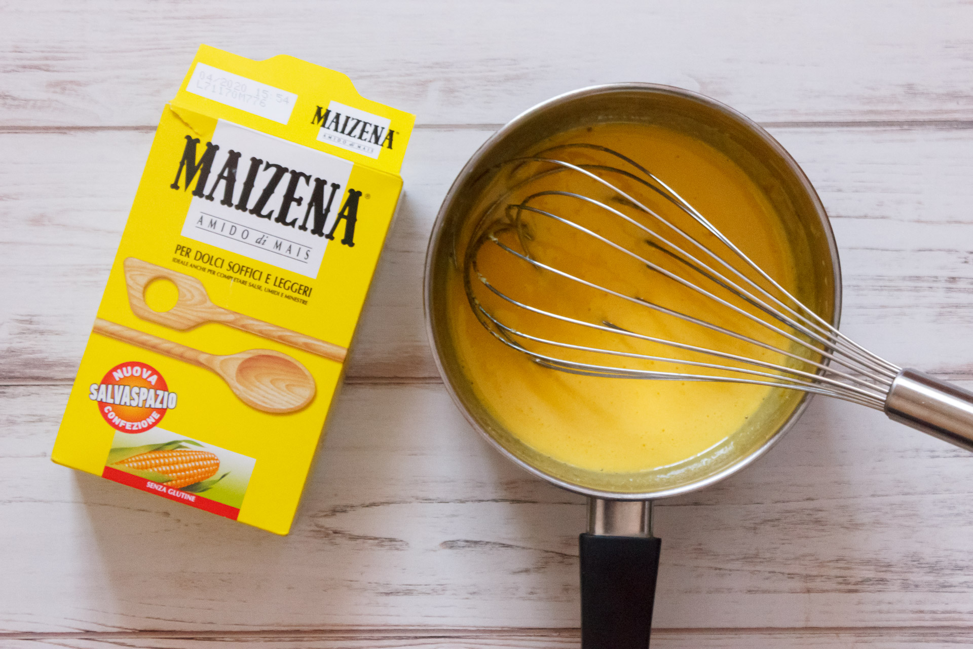 Aggiungi la maizena e un goccio di latte e mescola evitando la formazione di grumi.