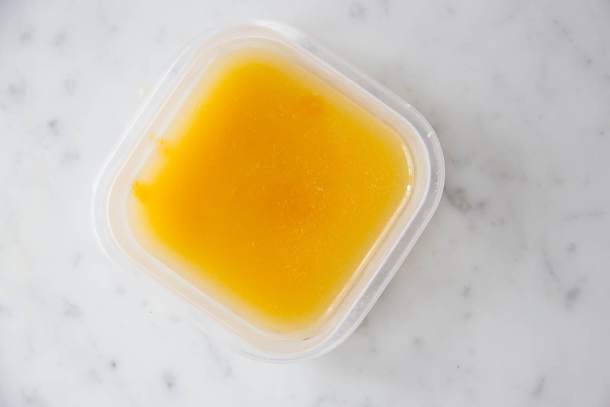 In un pentolino versa il succo di arancia, la marmellata di albicocche e il burro e mescola fino ad ottenere un composto liscio.