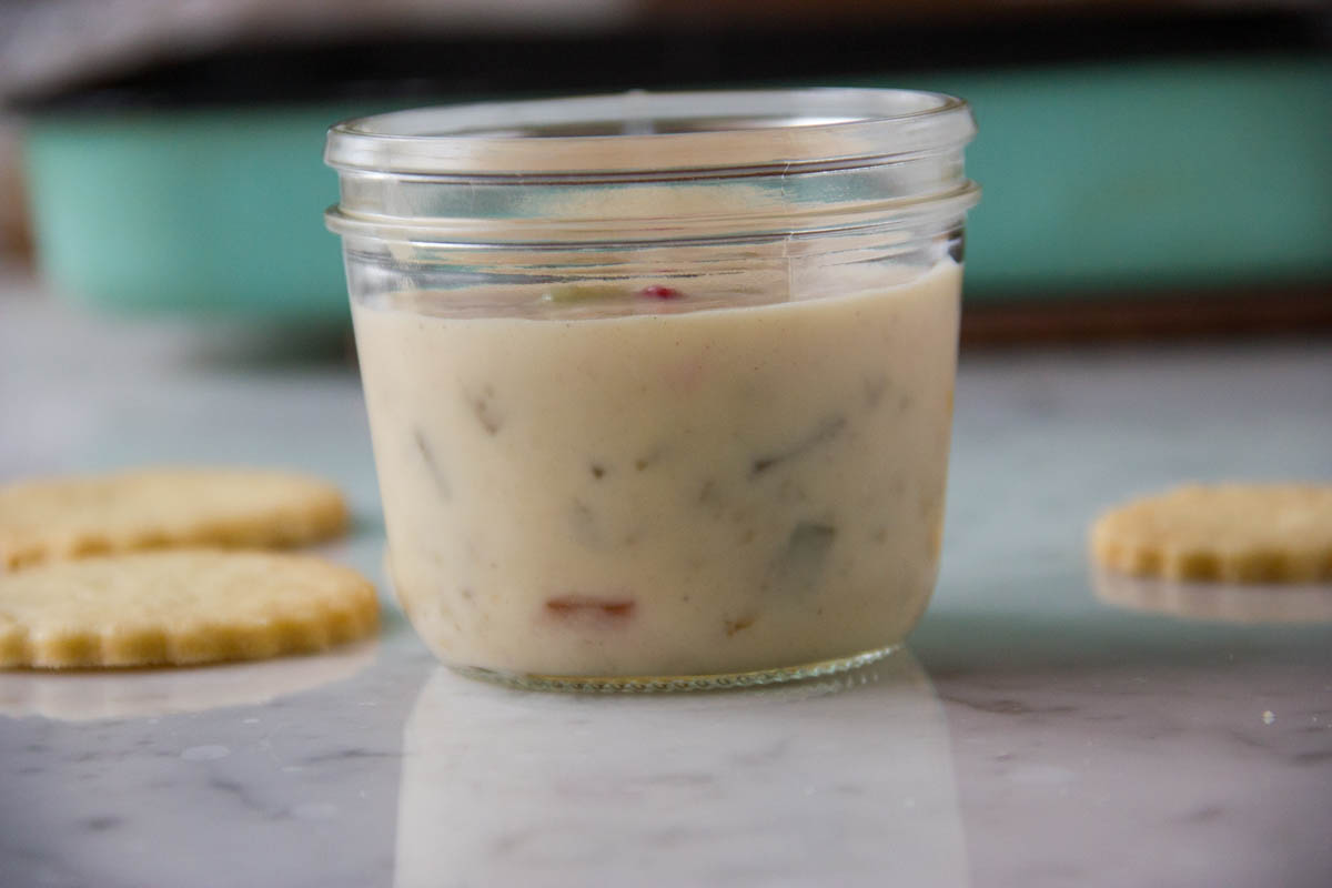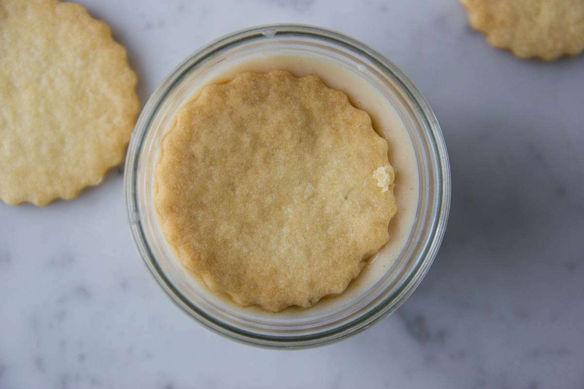 Poni sul fondo di ogni barattolo un disco di pasta frolla, versa il ripieno fino a metà del barattolo e finisci con un altro disco di pasta frolla.