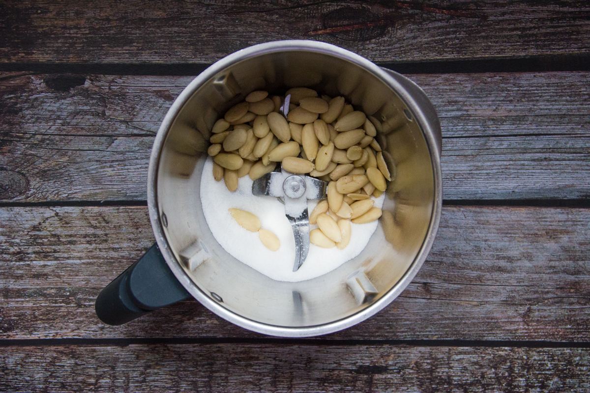 Frulla le mandorle con lo zucchero in un tritatutto (io ho usato il Bimby) per 20-30 secondi: le mandorle rilasceranno il loro olio e tenderanno a formare delle grosse briciole.