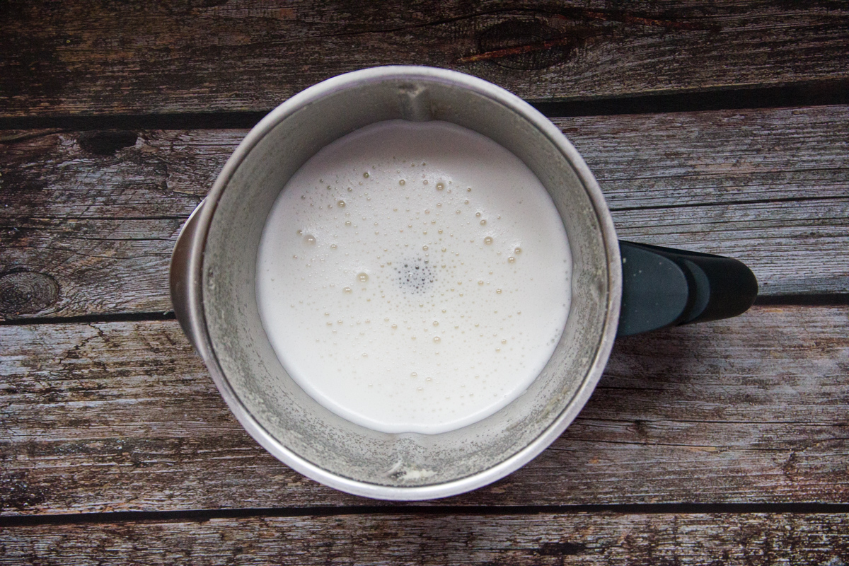 Versa l'acqua di mandorle in un contenitore con coperchio e metti in freezer. Mescola ogni 30 minuti per le due ore successive.