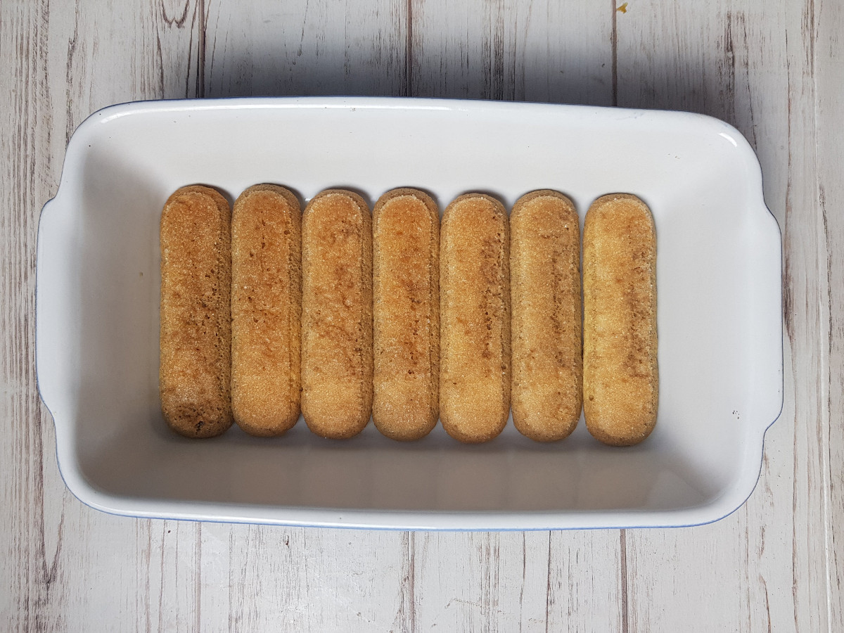 Intingi velocemente i savoiardi nel caffè freddo e disponili nella teglia.