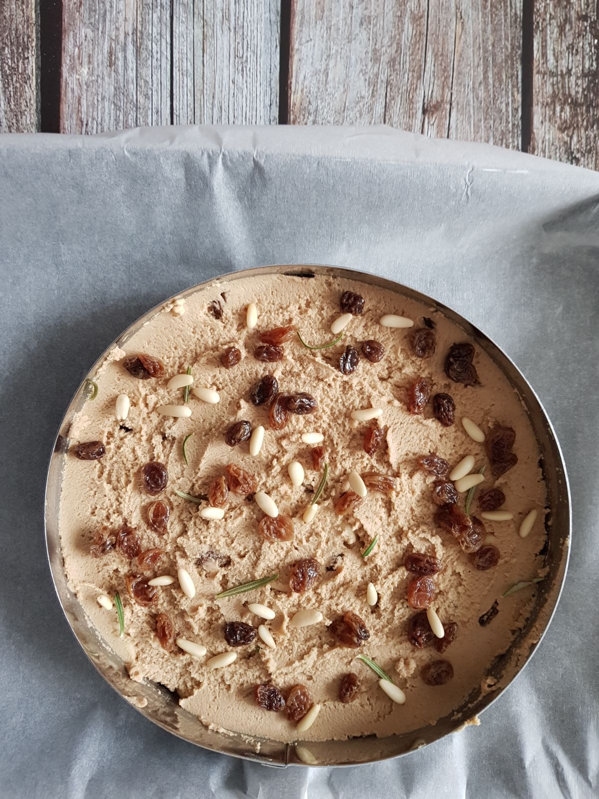 Decora la superficie con l'uva passa, i pinoli e i restanti aghi di rosmarino ed inforna a 180°C per 30 minuti.