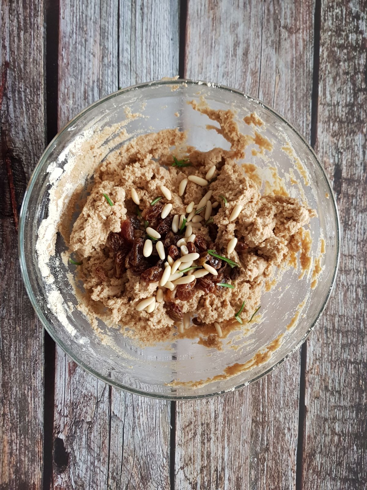 Aggiungi metà uva passa, metà pinoli e gli aghi di rosmarino sminuzzati.