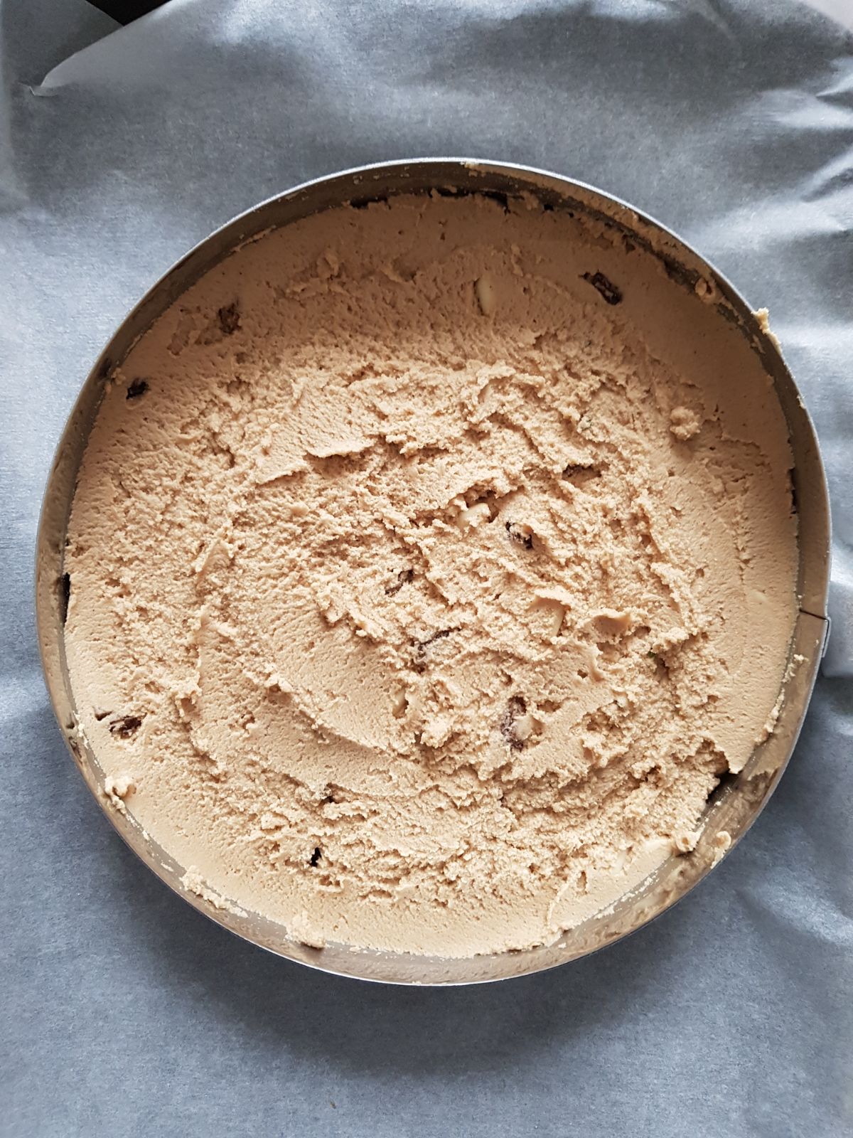 Rivesti una tortiera tonda di 22 cm di diametro con la carta da forno, versa l'impasto e livellalo bene con il dorso del cucchiaio.