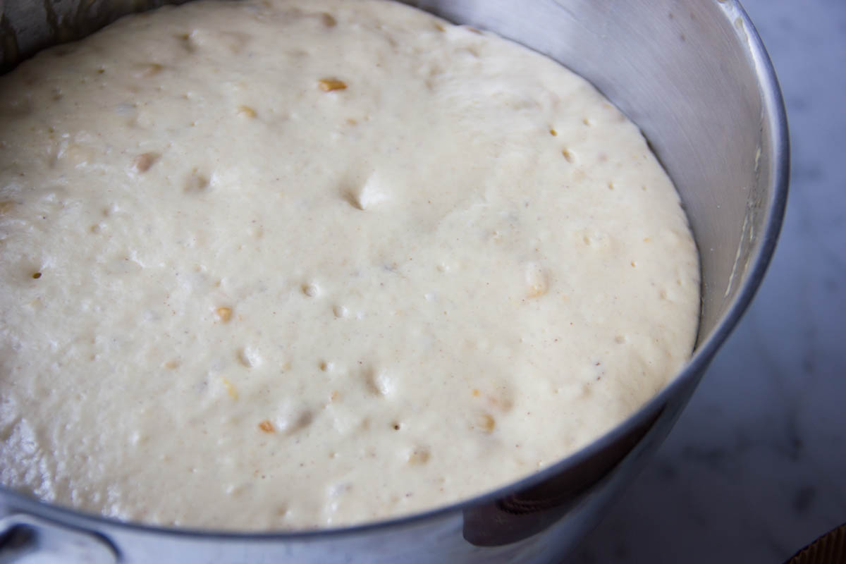 Versa i liquidi sugli ingredienti solidi e aggiungi l'acqua con il lievito. Impasta per 5 minuti e lascia lievitare per circa un'ora, coperta da uno strofinaccio.