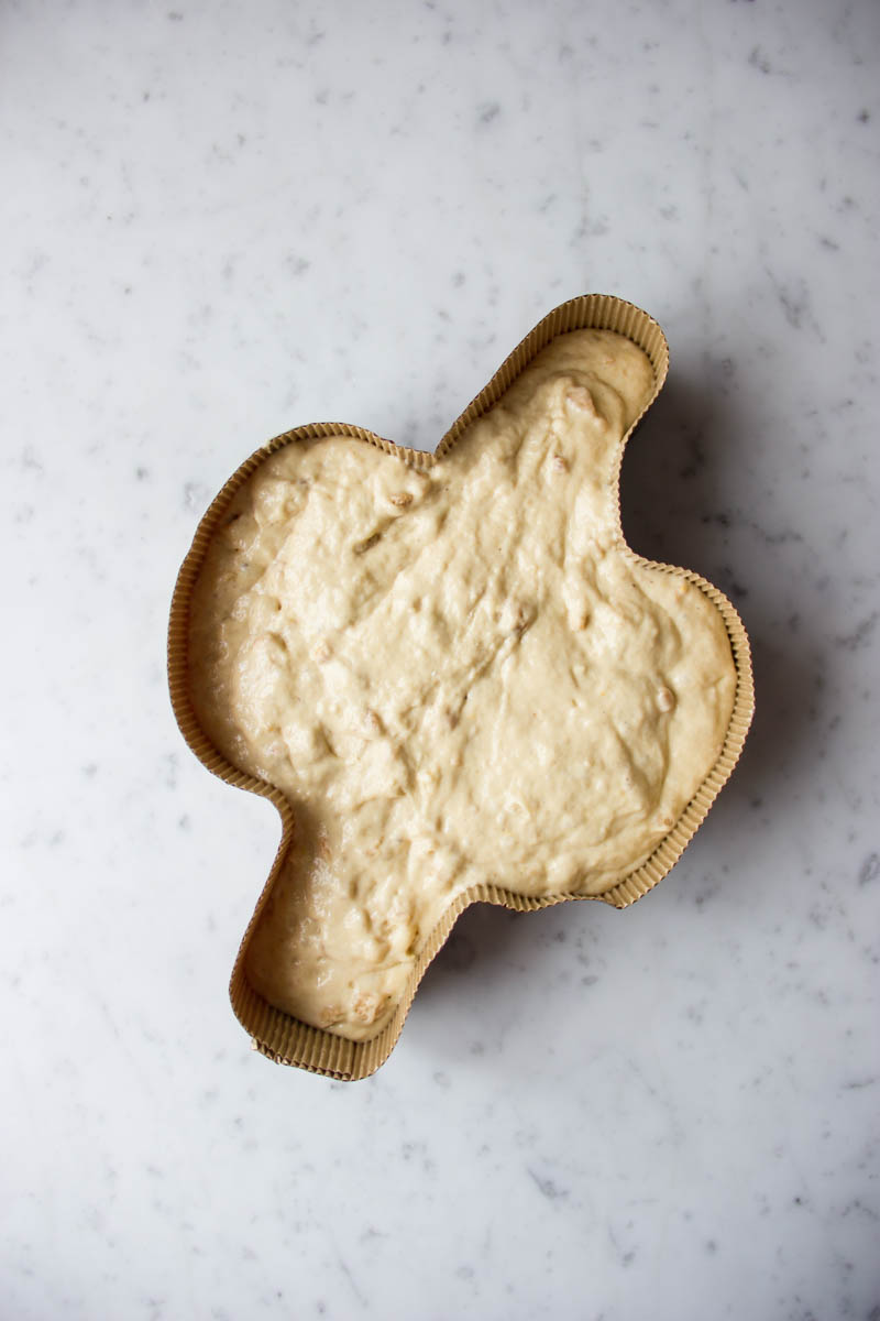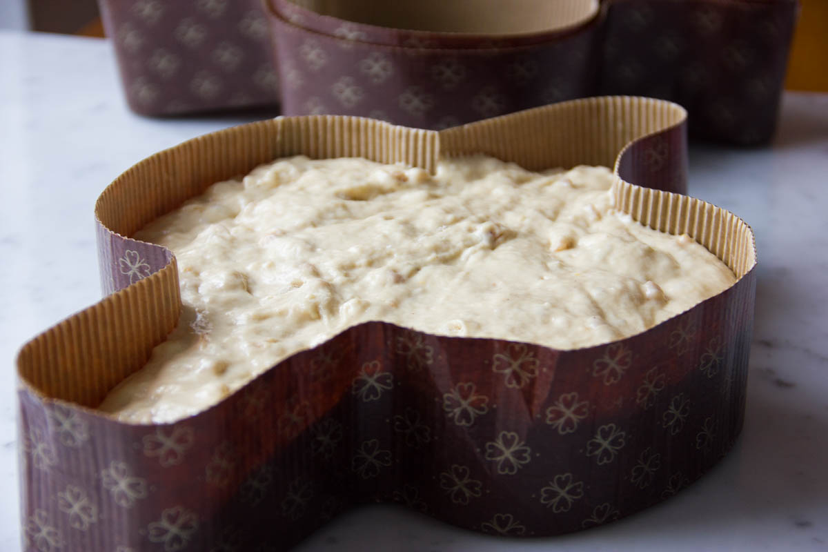 Trascorso il tempo, metti lo stampo della colomba in una teglia, versa l'impasto nella forma di carta della colomba e fai lievitare per un'altra ora.