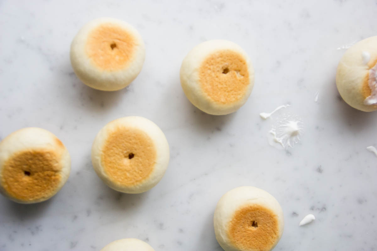 Farcisci facendo un buchino nella parte inferiore delle brioches e riempiendo con la crema.