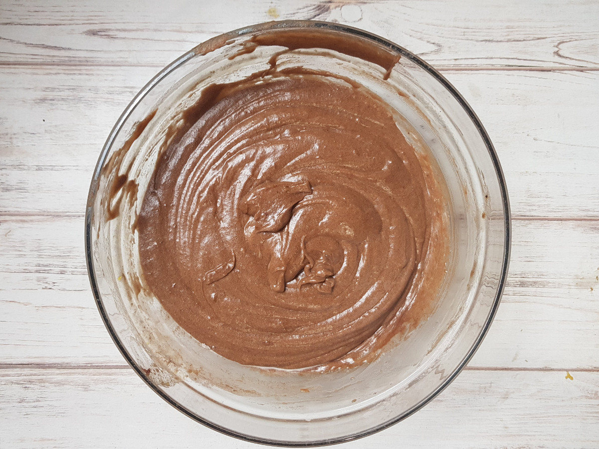 Setaccia insieme farina, lievito e cacao in un altro recipiente e versa gli ingredienti secchi e setacciati sull'impasto a base di uova e zucchero.