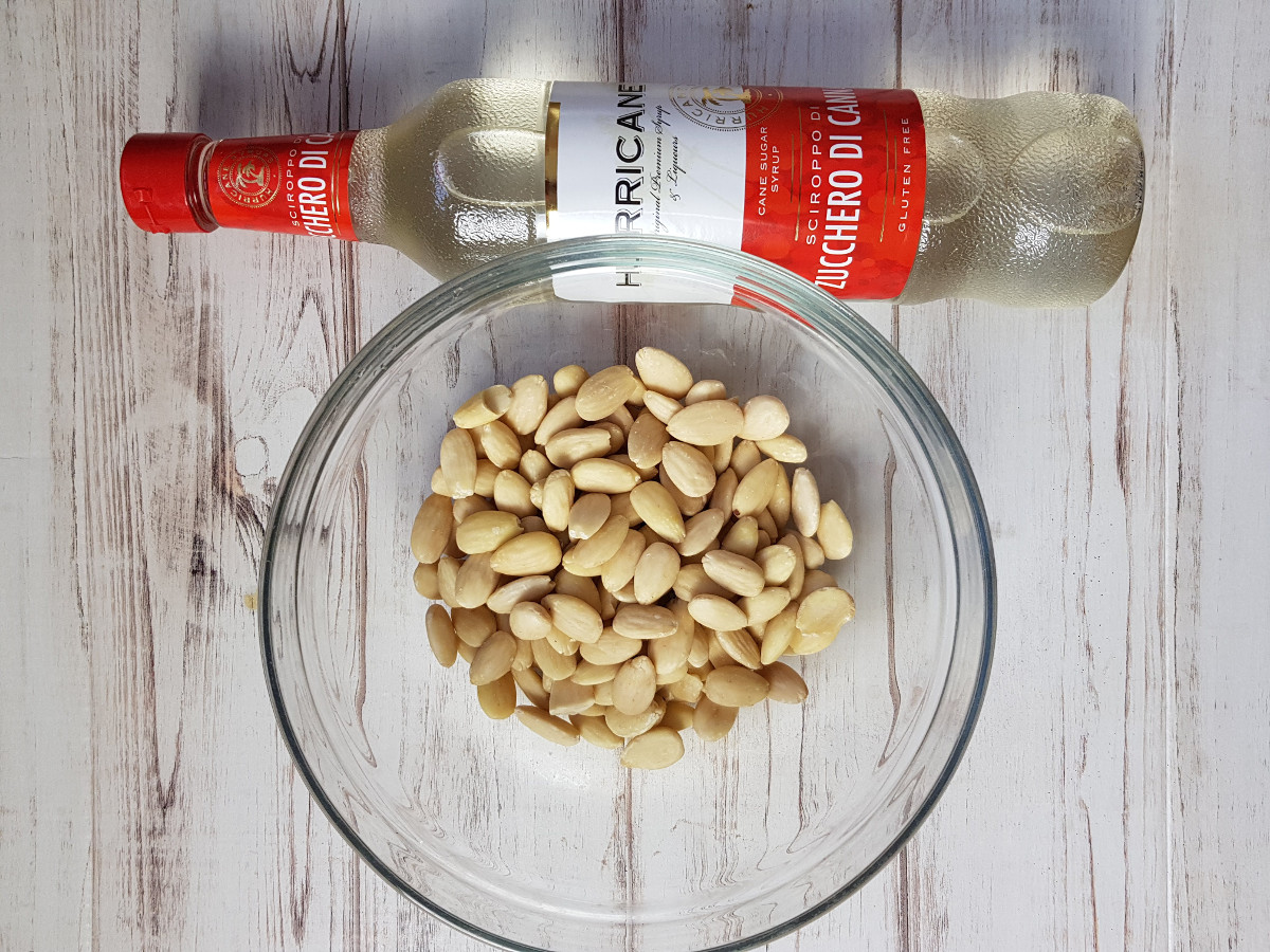 Disponi le mandorle in una ciotola e aggiungi lo sciroppo di zucchero di canna.