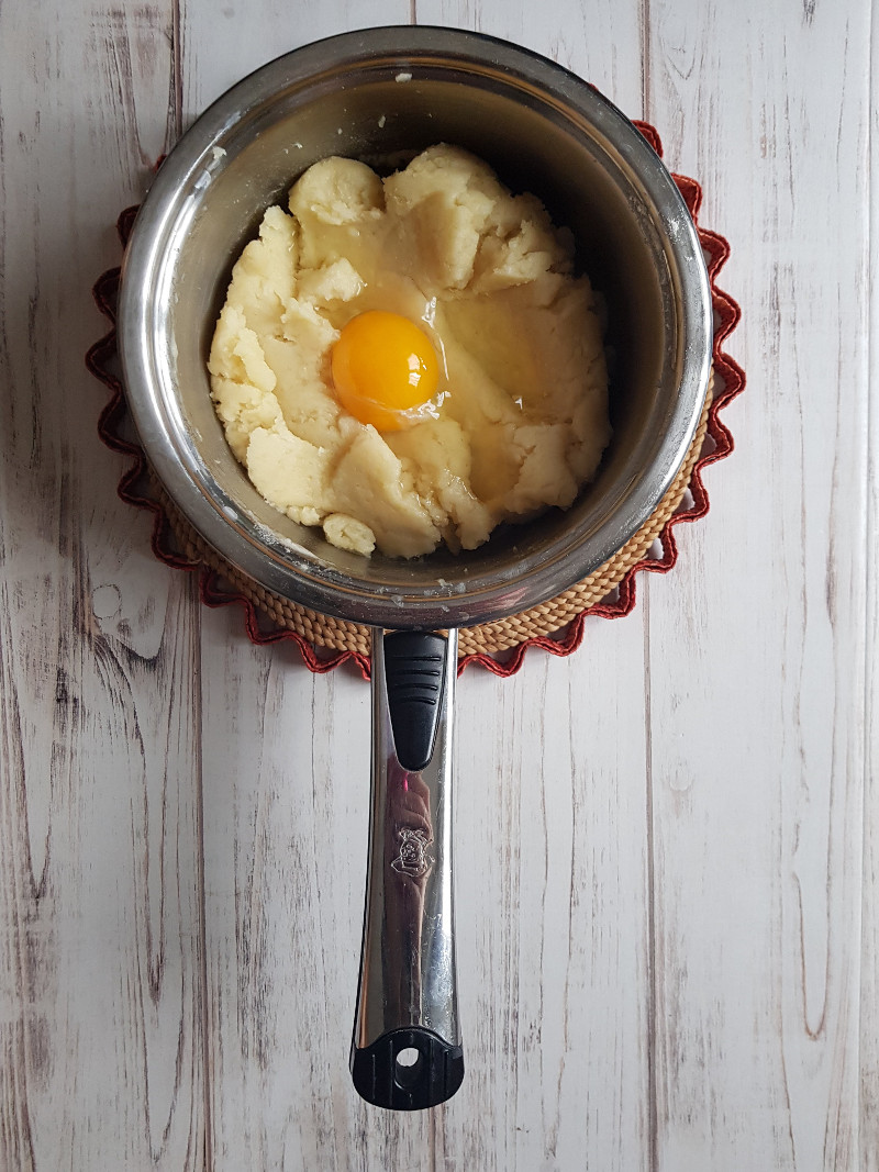 Trasferisci il composto in una ciotola e aggiungiun uovo alla volta (non aggiungere il successivo fino a quando l'uovo precedente non è stato assorbito totalmente).