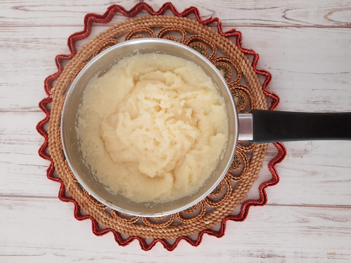 Trasferisci il semolino bollente in un piatto e copri con la pellicola a contatto.