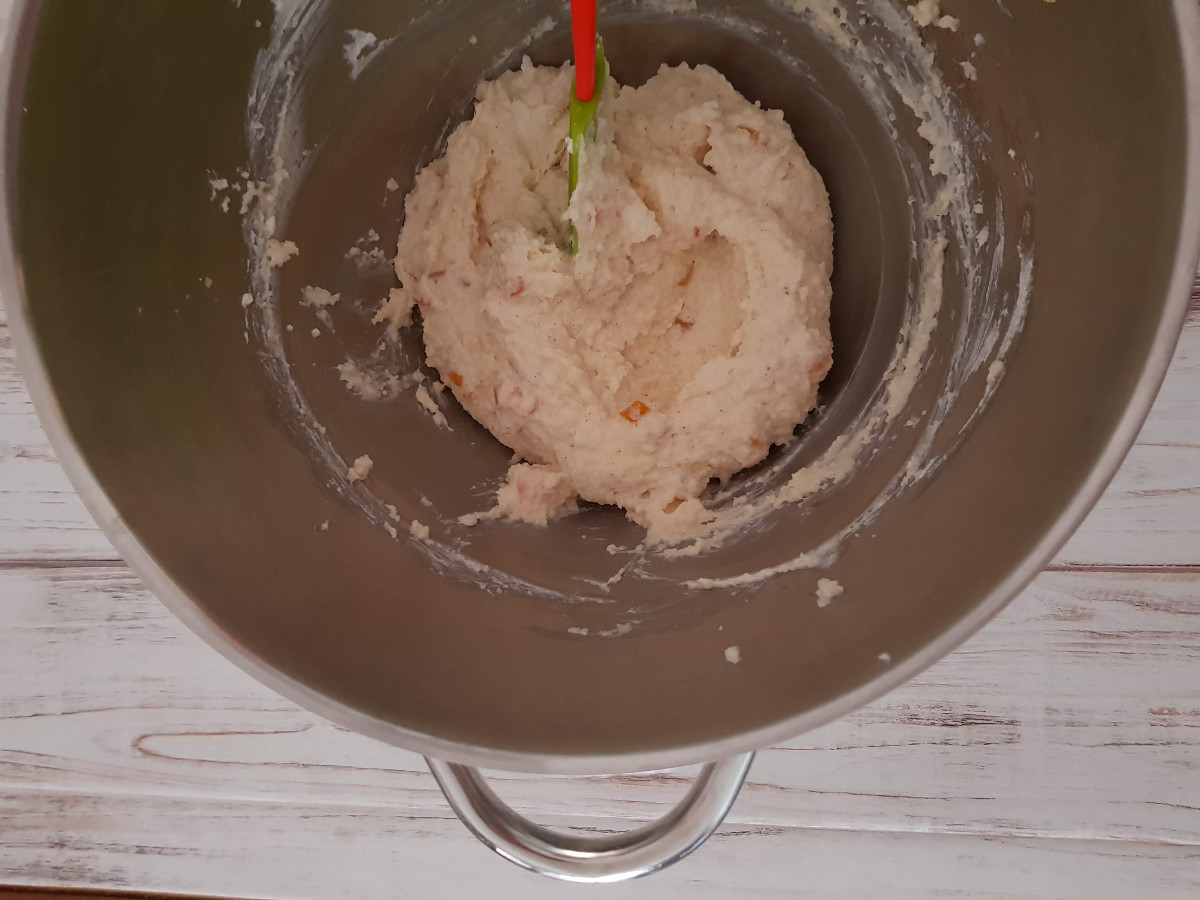 Aggiungi la polpa di vaniglia, la buccia di arancia grattugiata e l'arancia candita. Mescola velocemente e trasferisci in una sac à poche senza bocchetta.