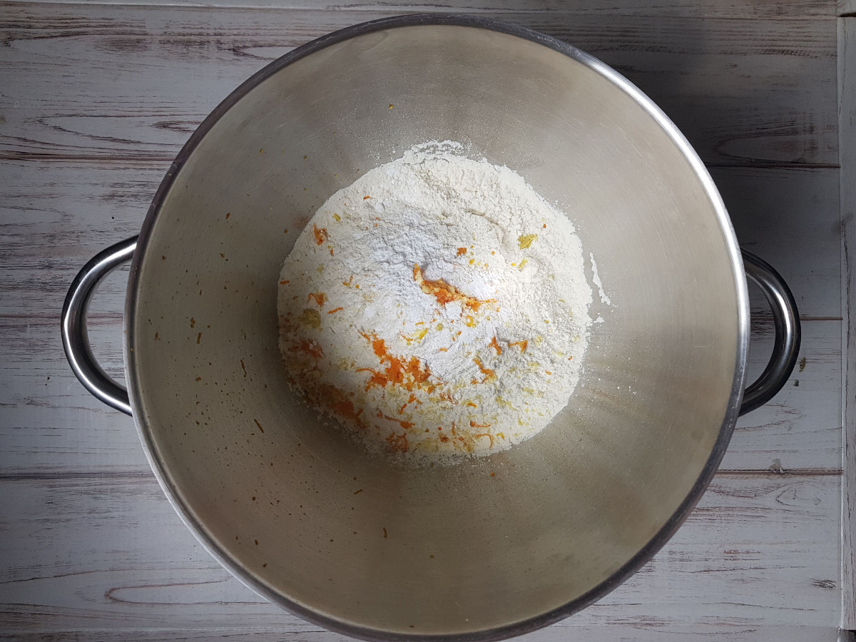 In una ciotola mescola la farina con il lievito e le bucce di arancia e limone grattugiate.