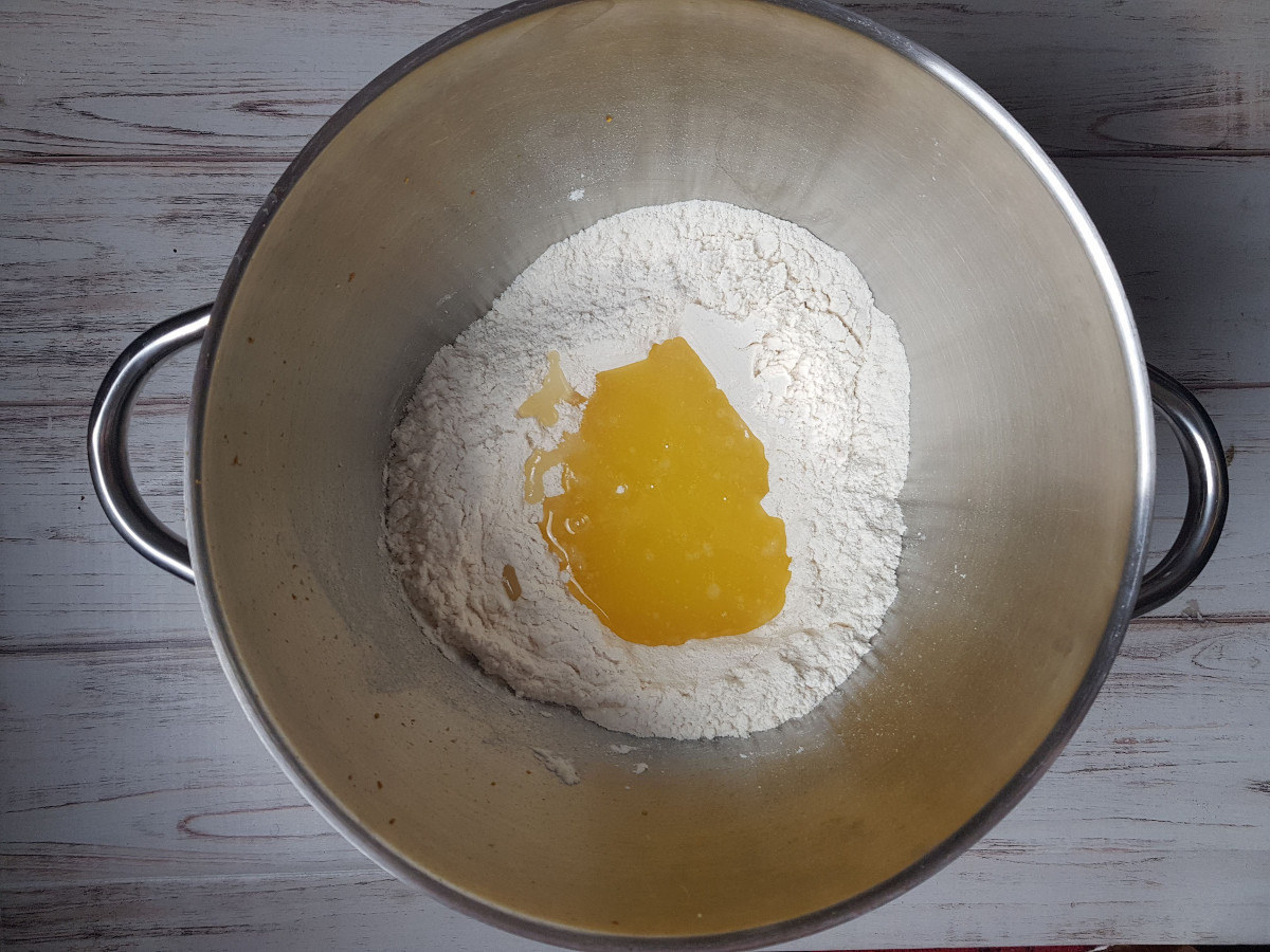 Aggiungi i liquidi (burro, liquore e zucchero) nella farina e mescola in modo uniforme, in maniera da ottenere una sabbiatura.