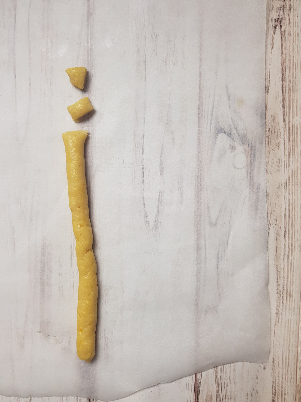 Trascorsi i 30 minuti, fai dei cilindretti con l'impasto e taglia con un coltello dei piccoli pezzetti di impasto (circa mezzo centimetro) perché il lievito li farà crescere molto.