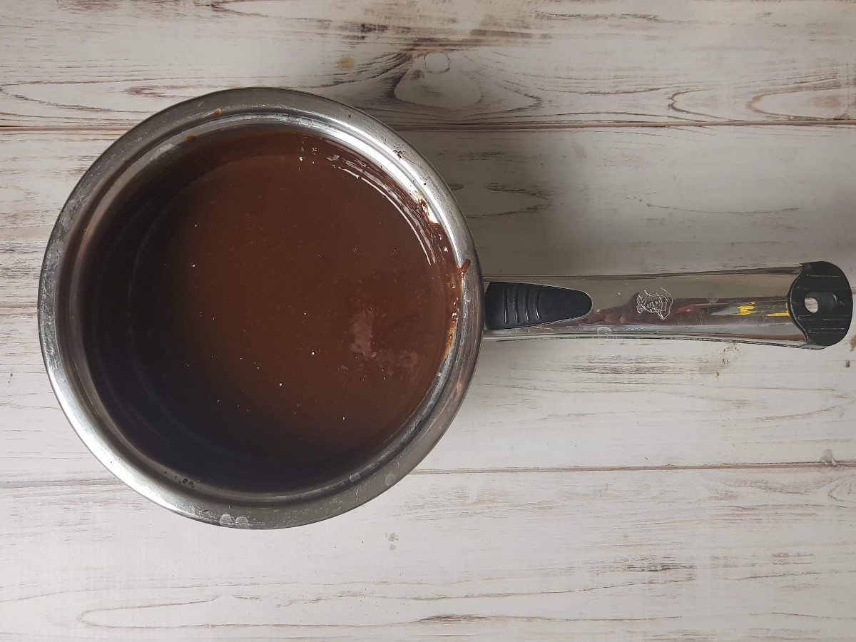 Taglia il cioccolato finemente e aggiungilo alla panna bollente. Mescola partendo dal centro verso l'esterno fino ad ottenere una ganache liscia e omogenea.