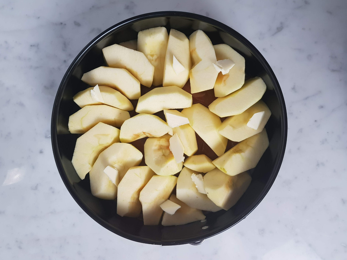 Fodera il fondo di una tortiera apribile (diametro 22 cm) con la carta da forno e distribuisci il caramello. Disponi le mele e versa sopra altro caramello.