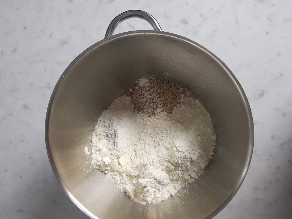 Nella ciotola della planetaria, aggiungi tutte le polveri e mescola per un minuto con la foglia.