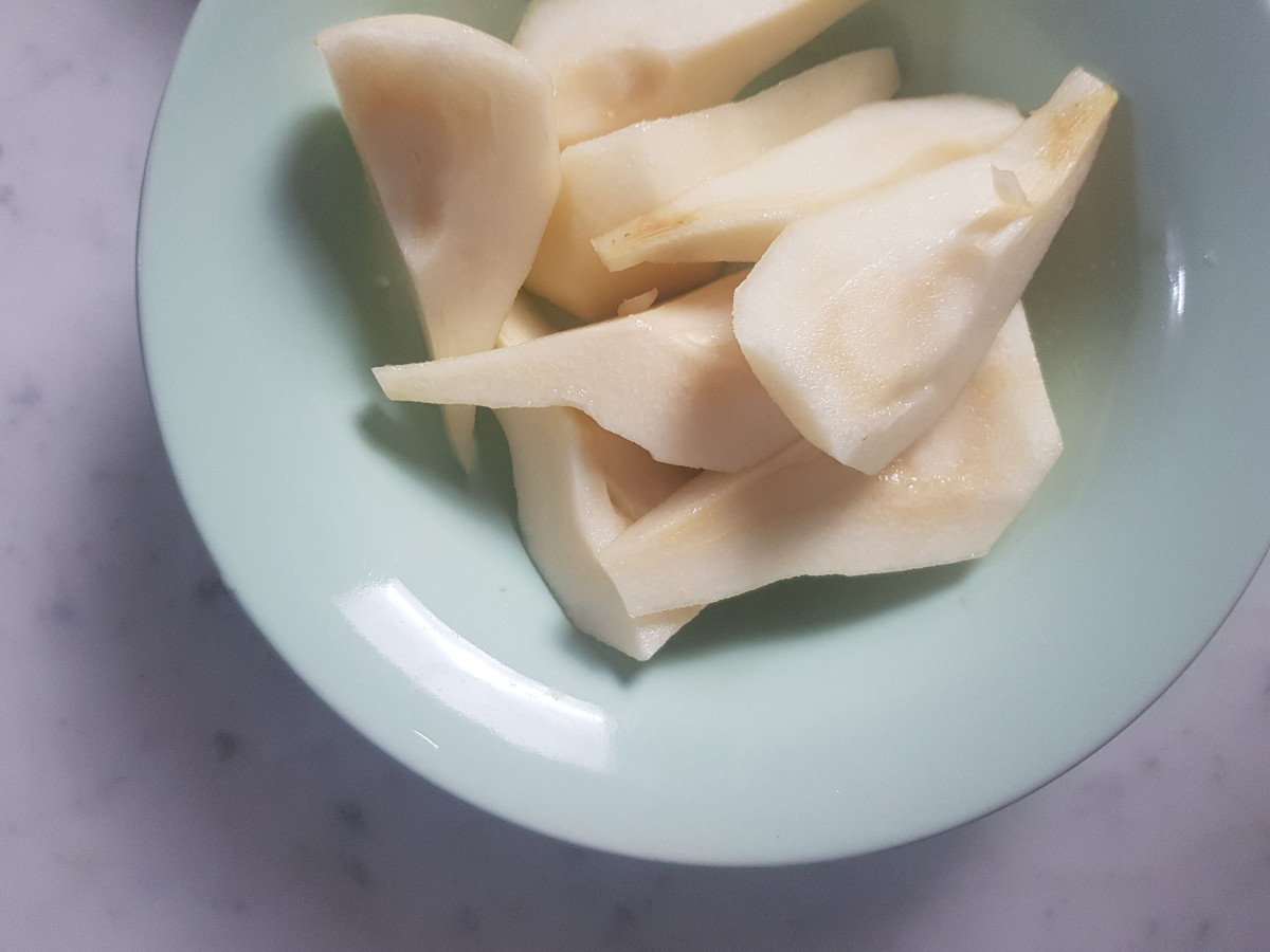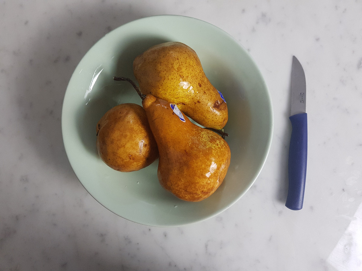 Sbuccia le pere e tagliale in quarti.
