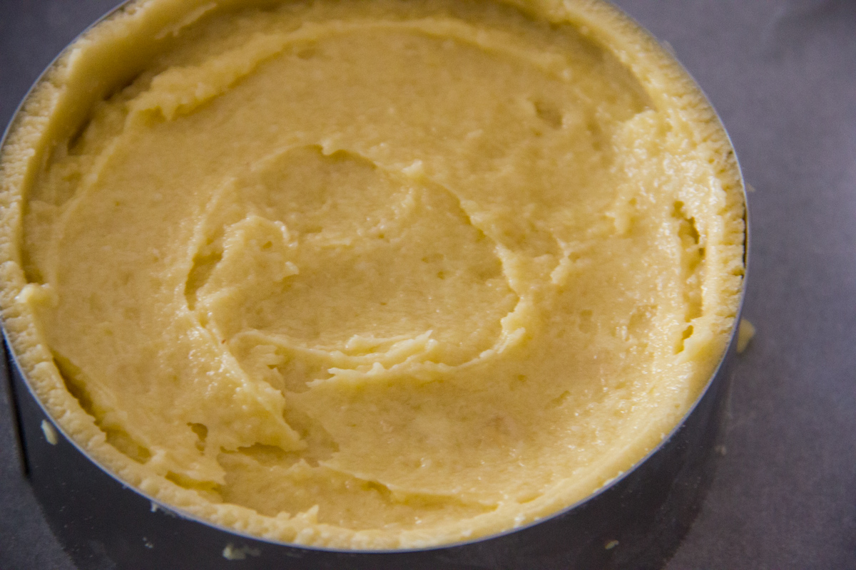 Versa la crema frangipane al centro e stendila con un cucchiaio fino a 2 cm dal bordo, non riempire fino all'orlo perché la crema aumenta di volume durante la cottura.