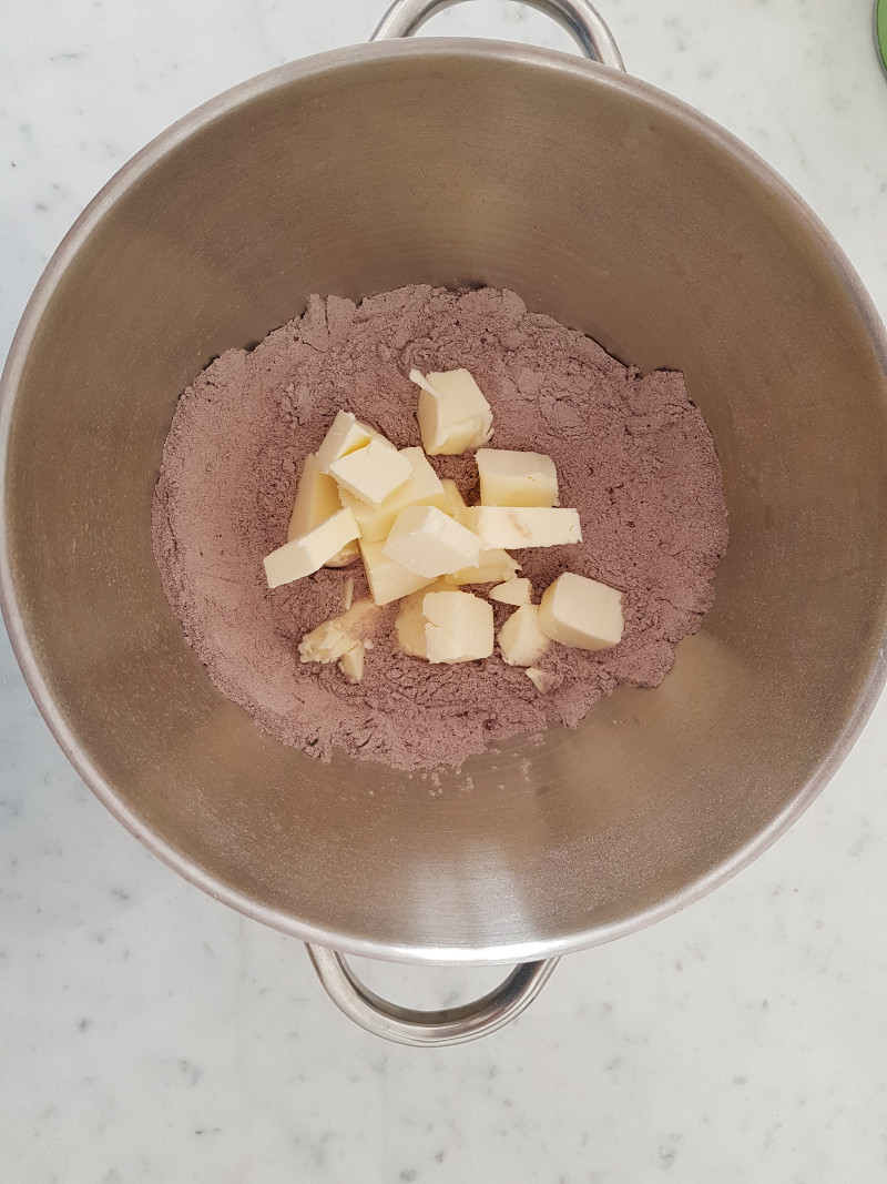 In una ciotola mescola tutti gli ingredienti secchi (farina, cacao, zucchero, sale). Aggiungi il burro a tocchetti e impasta velocemente con la punta delle dita.