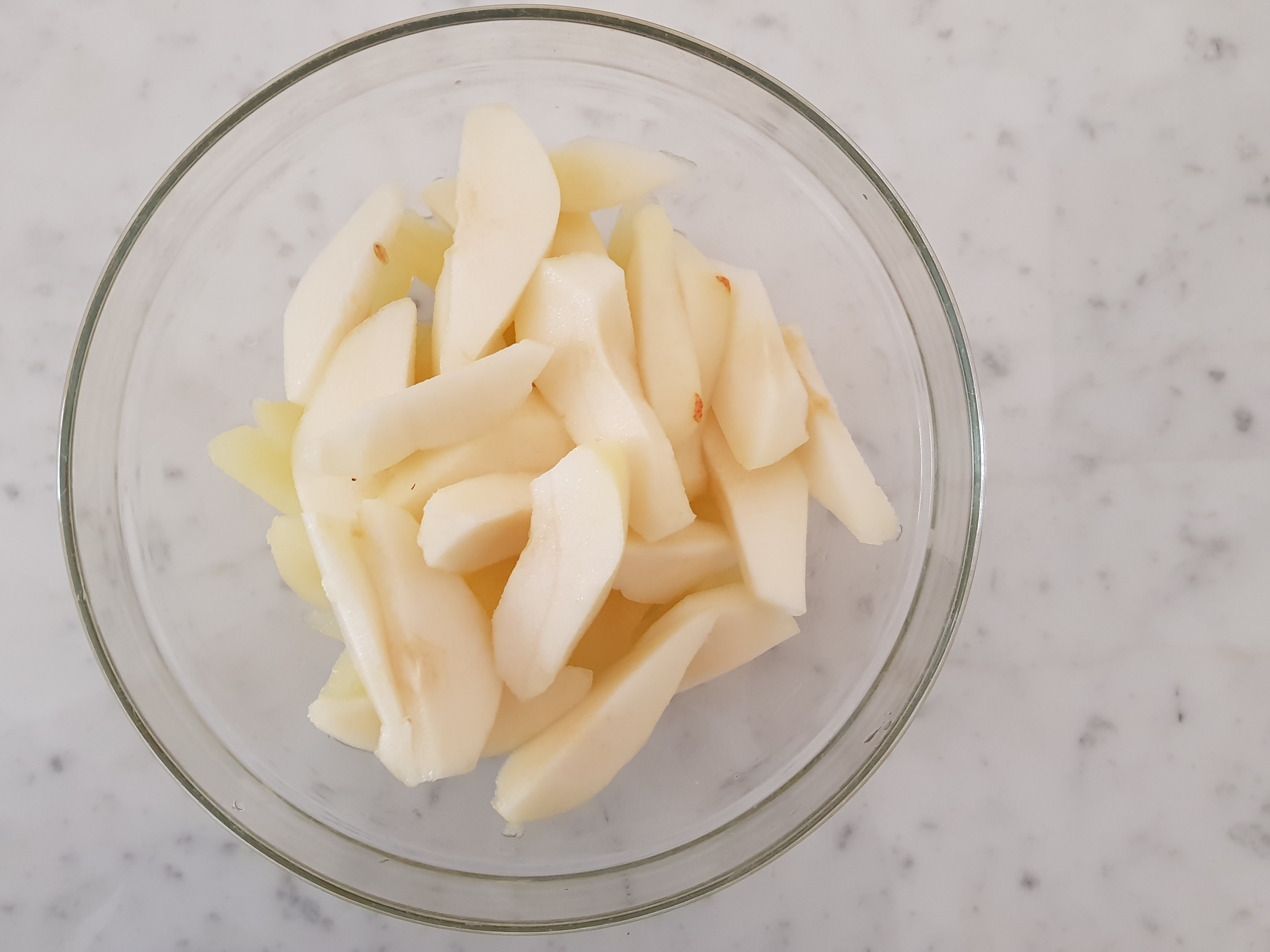 Lava, sbuccia e taglia a fettine le pere. Trita finemente il cioccolato. Metti le pere, il cioccolato e la cannella in una ciotola e mescola con un cucchiaio.