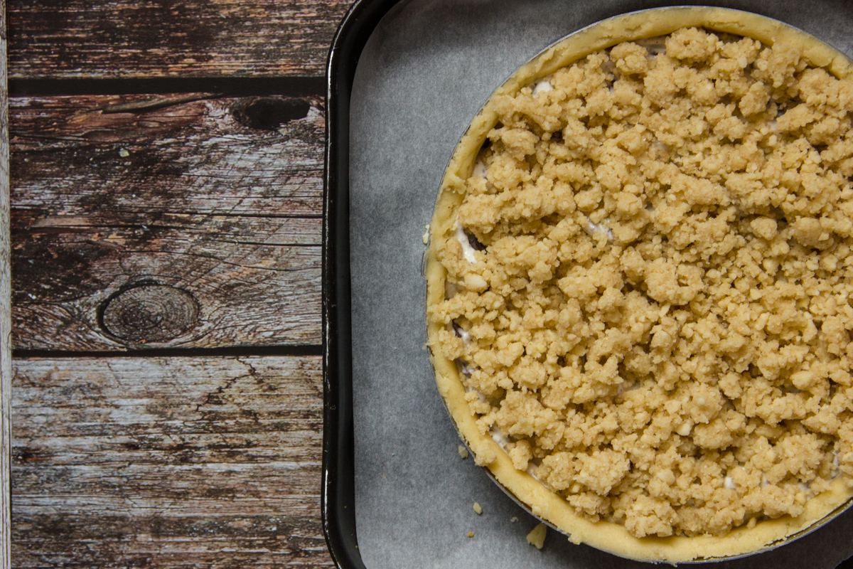 Copri il ripieno con il crumble e inforna la sbriciolata in forno già caldo per 30 minuti.